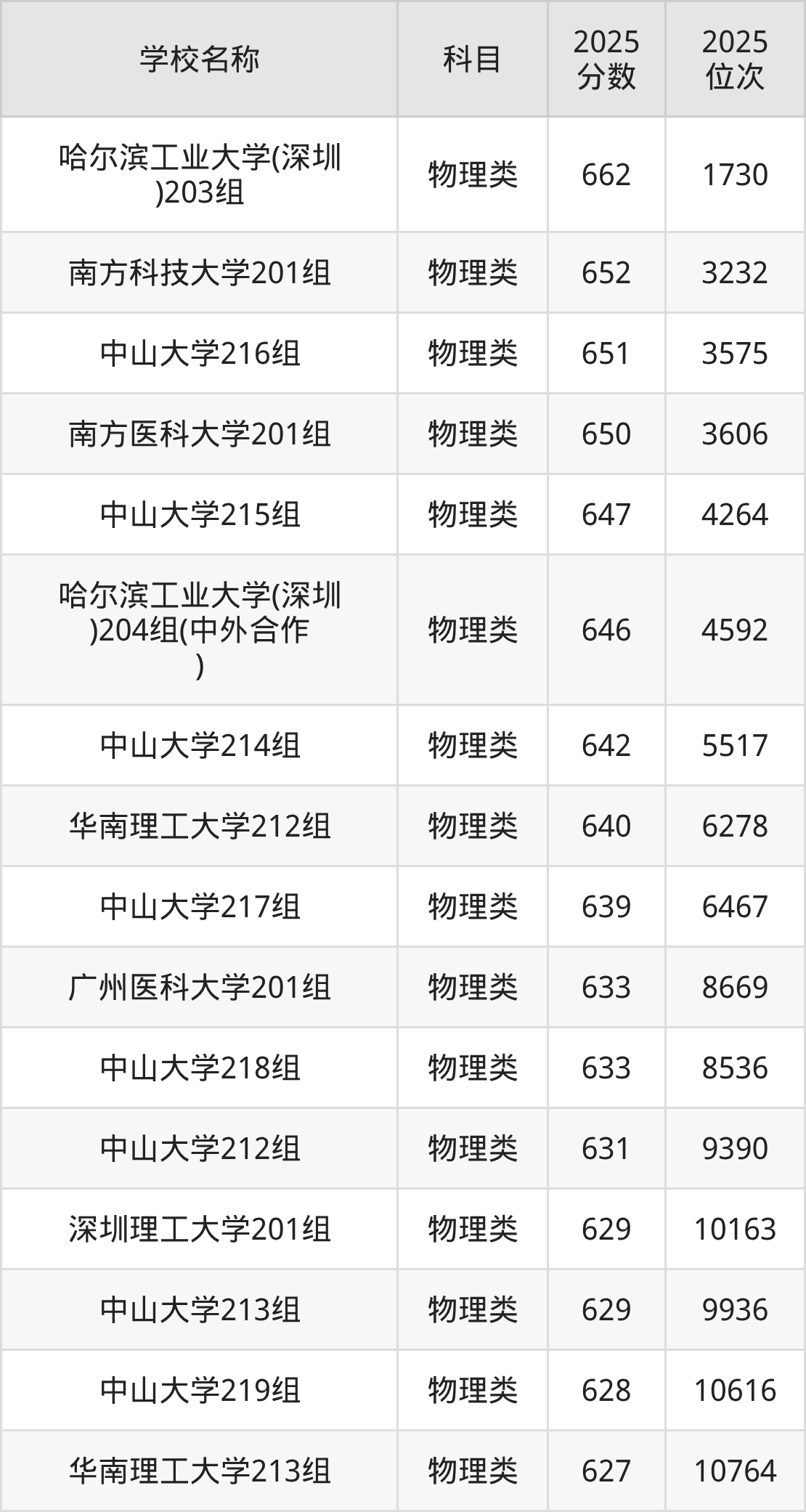 根据2025年广东本科大学在广东省物理类招生录取分数线来看,广东物理类最难考、分数线最高的本科大学为哈尔滨工业大学(深圳),录取分数线为662分;广东物理类收分最低的本科大学为广州科技职业技术大学,录取分数线为303分。