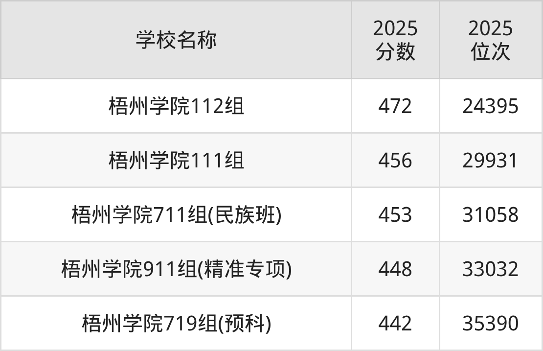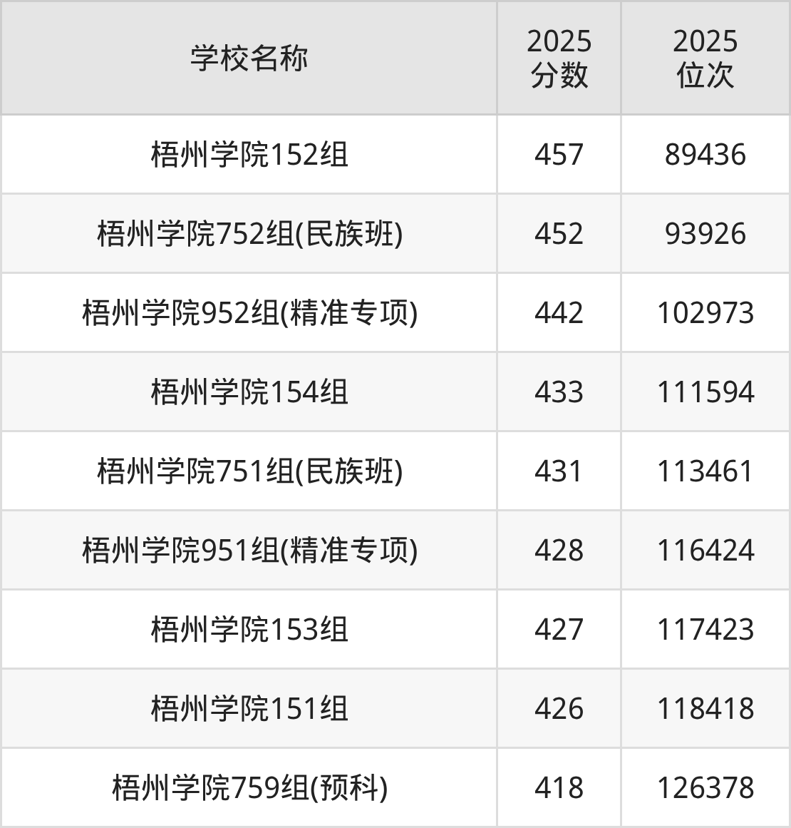 下文为2025年梧州本科大学在广西历史类录取分数线和位次排名表,供大家参考: