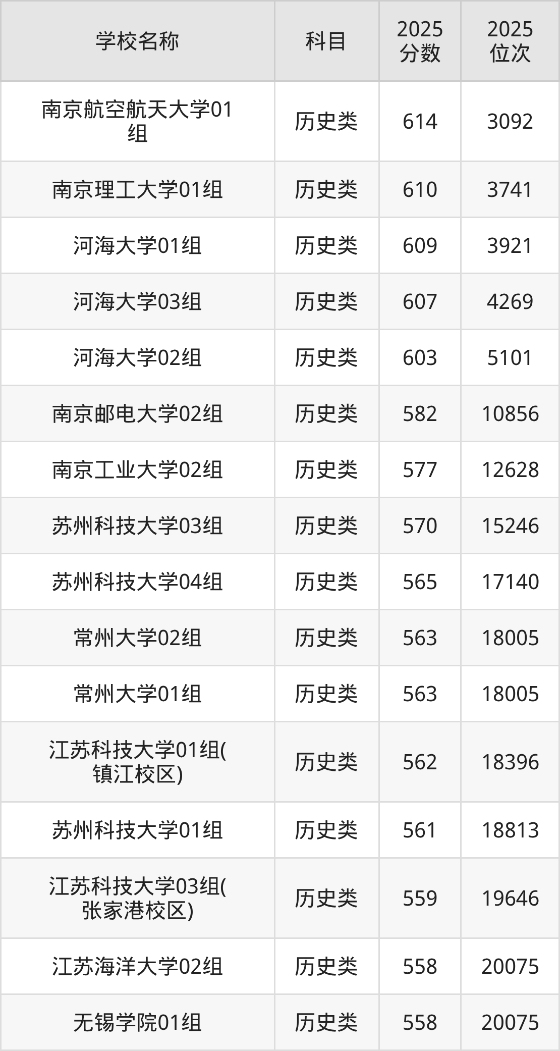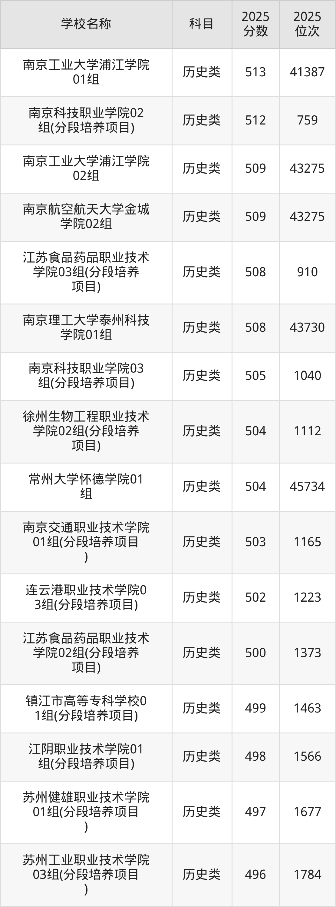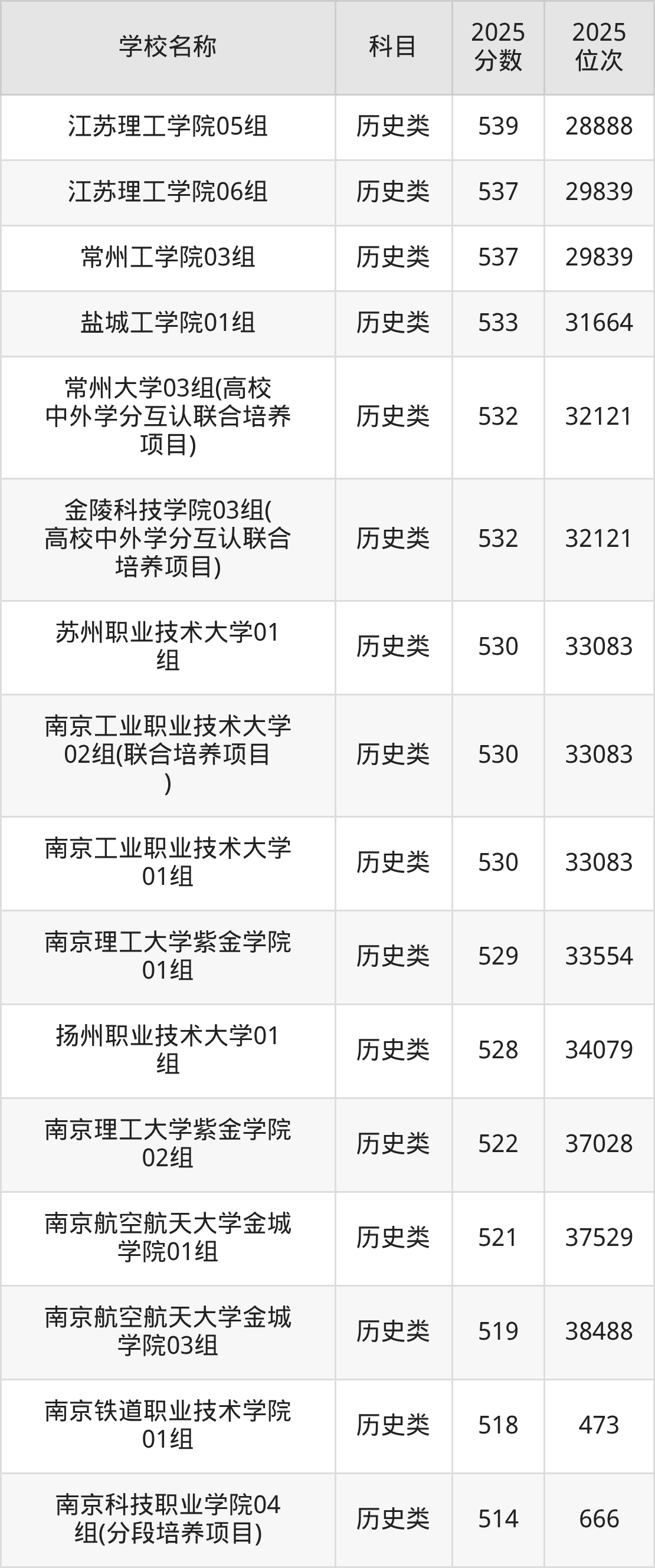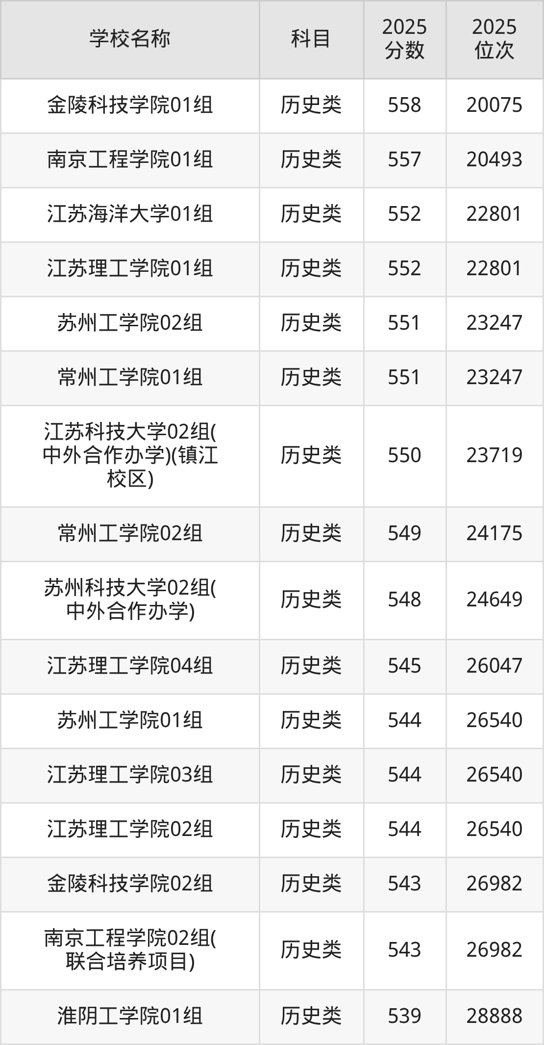 下文为2025年江苏省理工类大学在江苏历史类录取分数线和位次排名表,供大家参考: