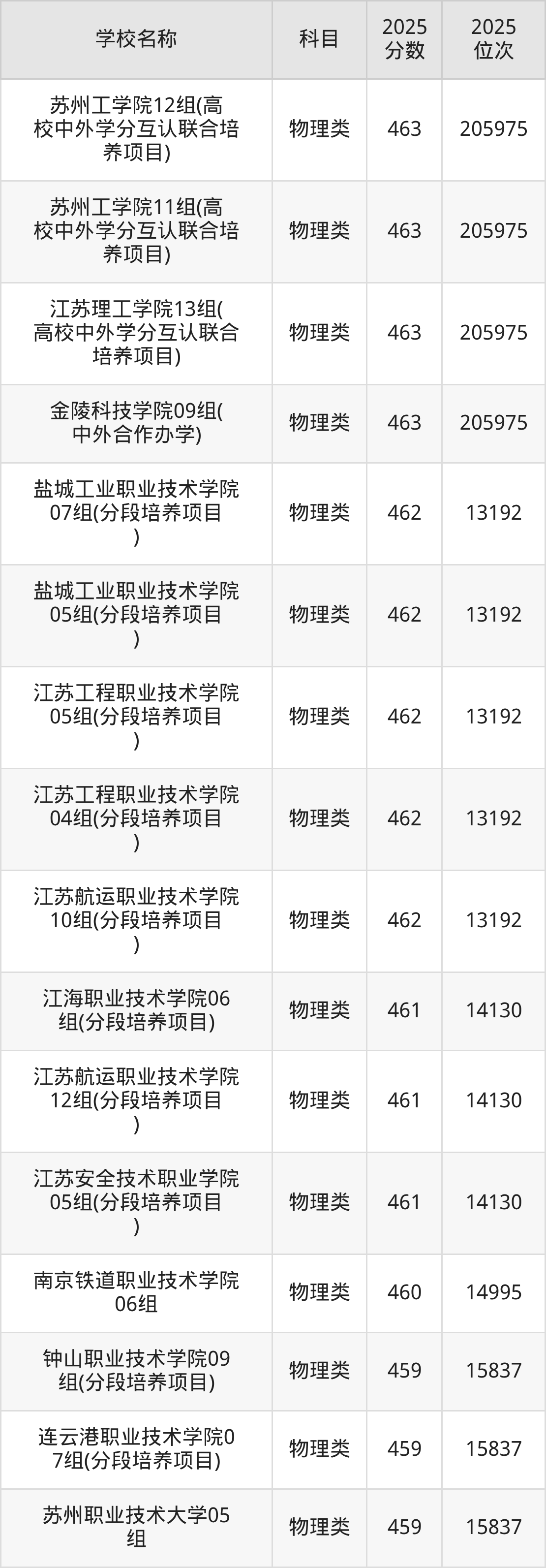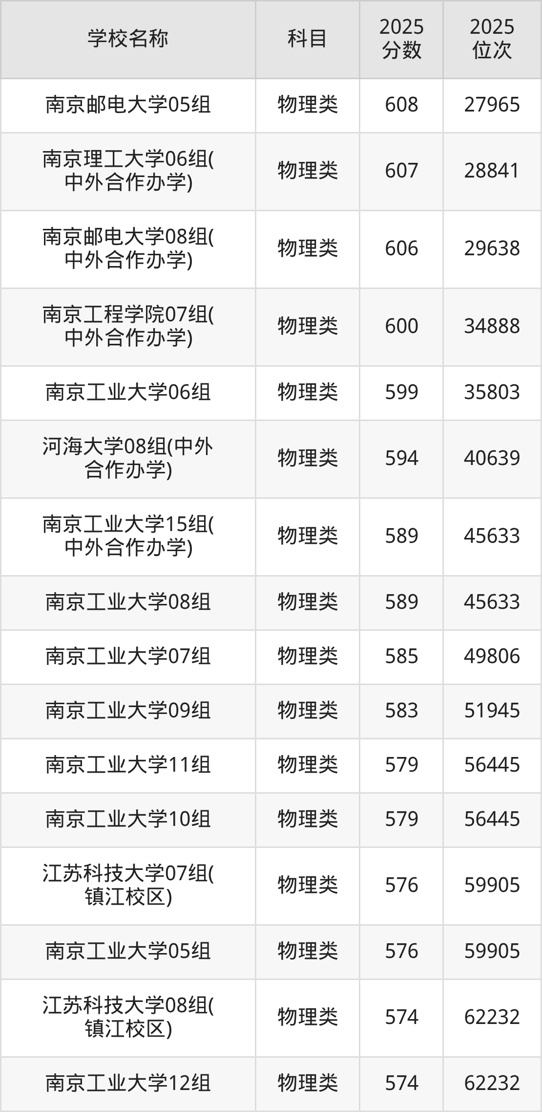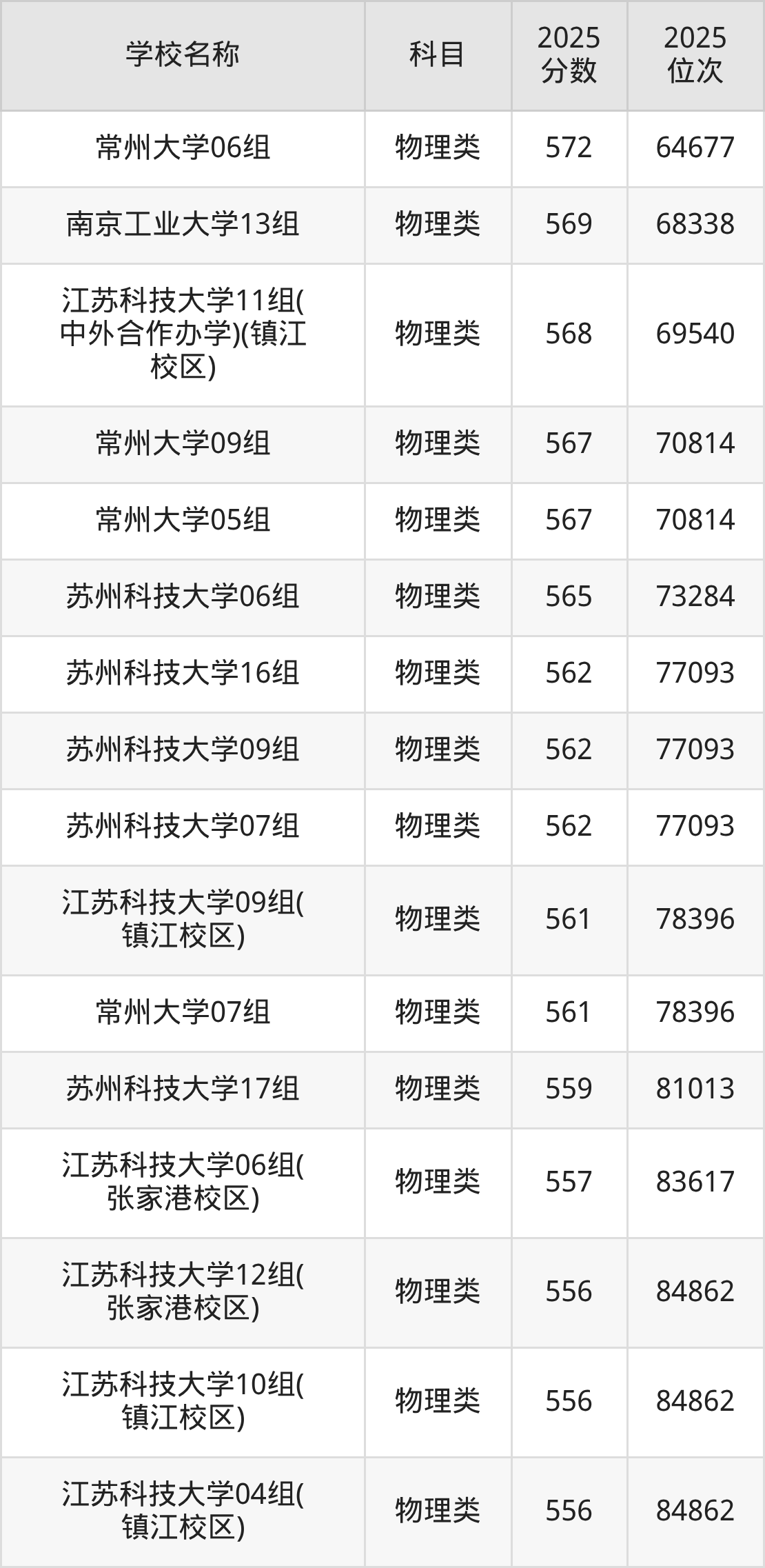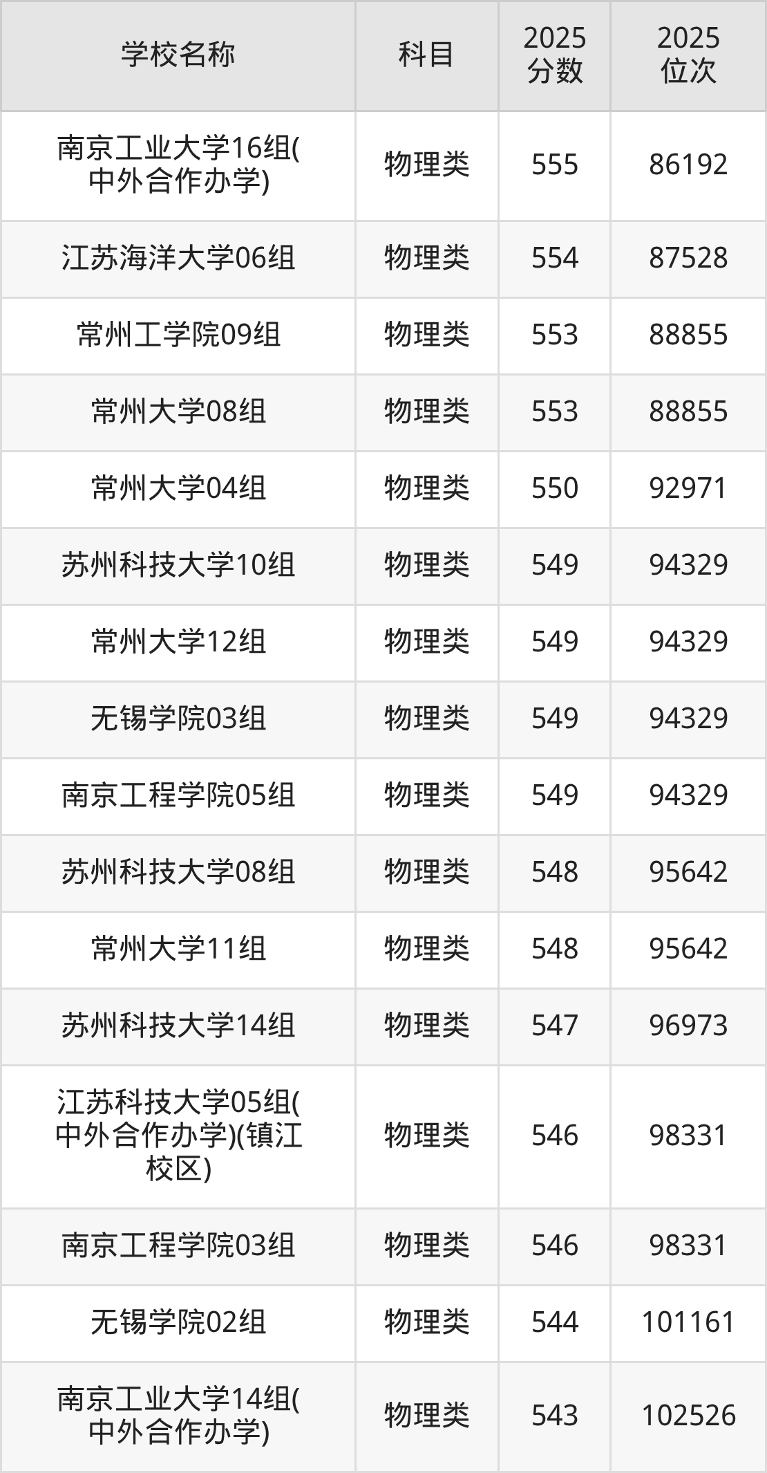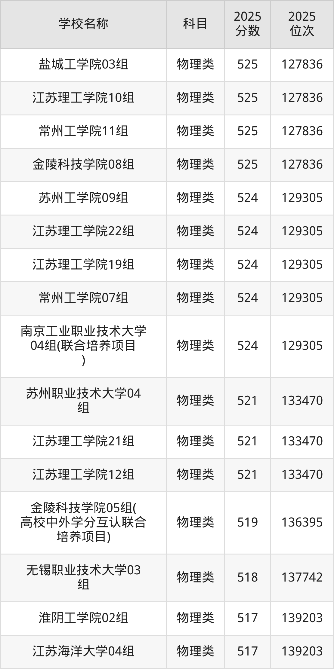 下文为2025年江苏省理工类大学在江苏物理类录取分数线和位次排名表,供大家参考: