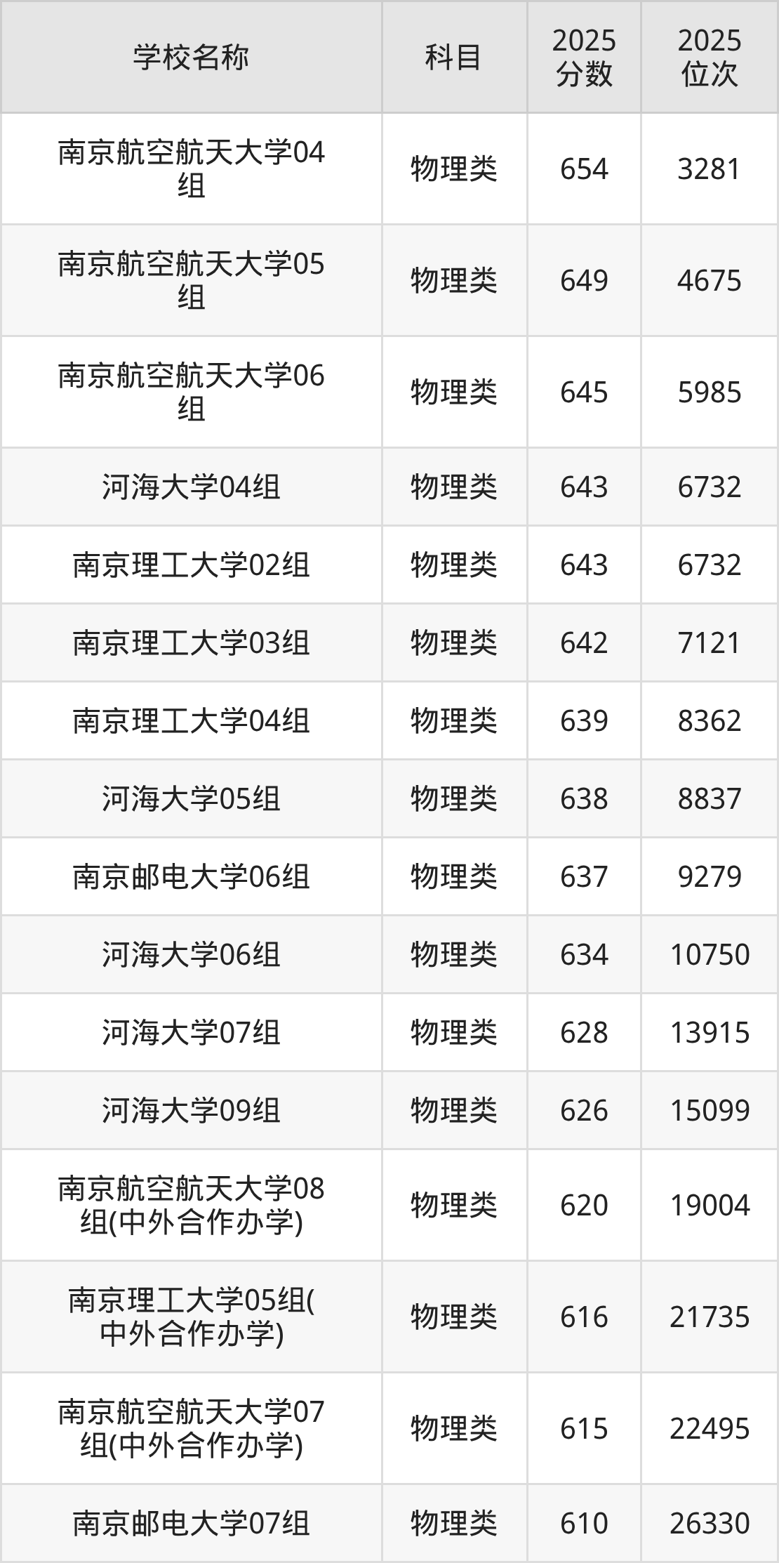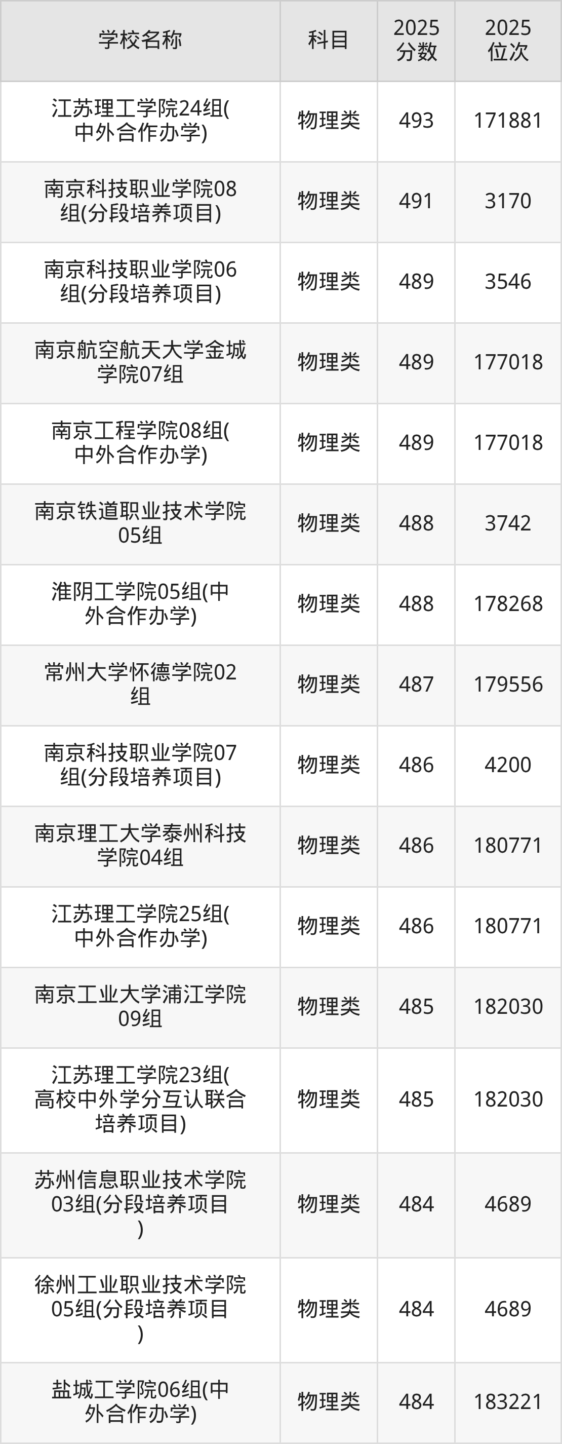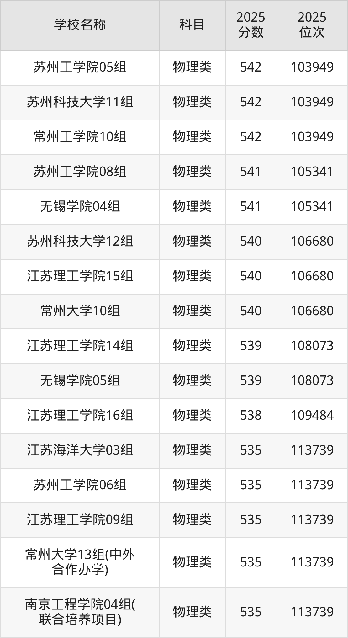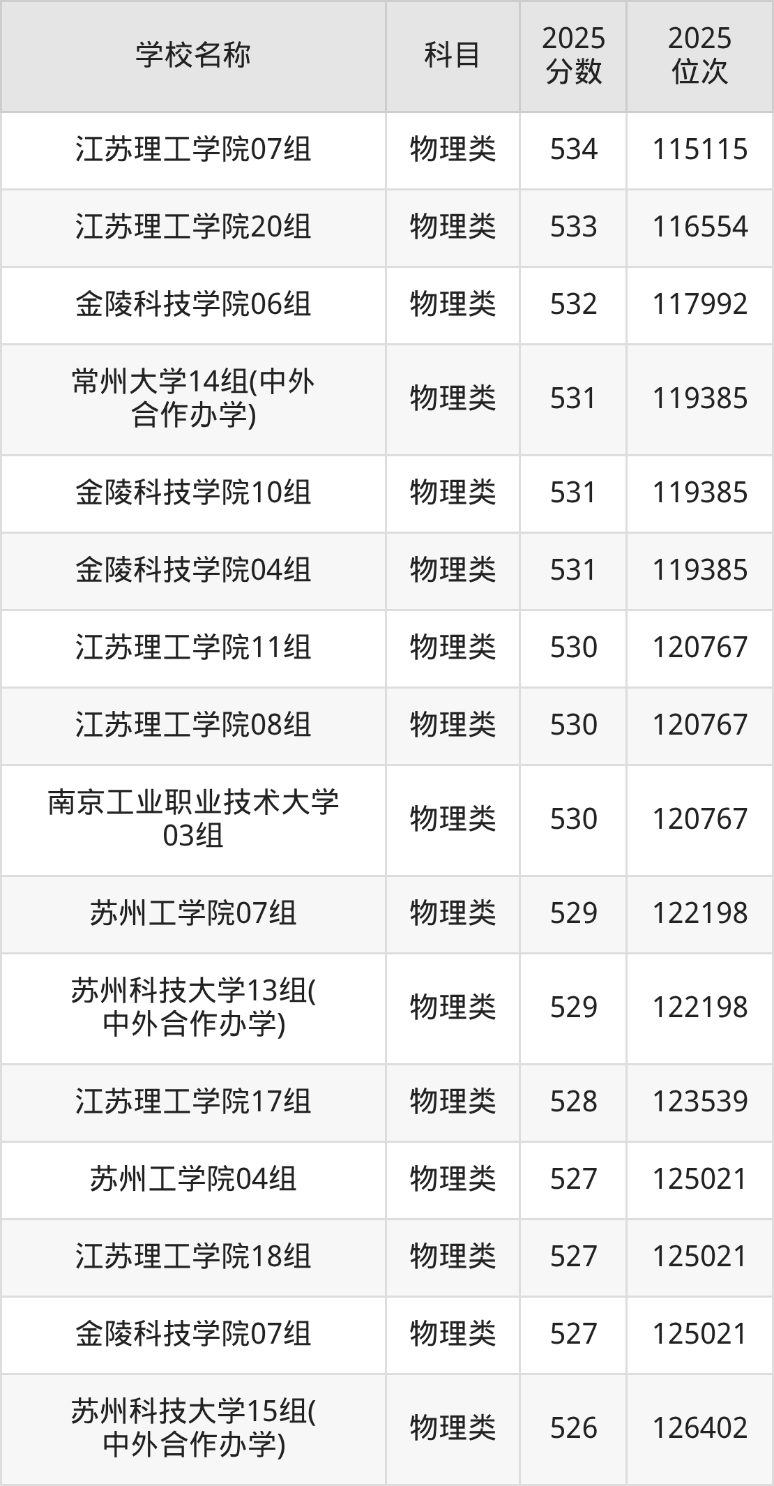 下文为2025年江苏省理工类大学在江苏物理类录取分数线和位次排名表,供大家参考: