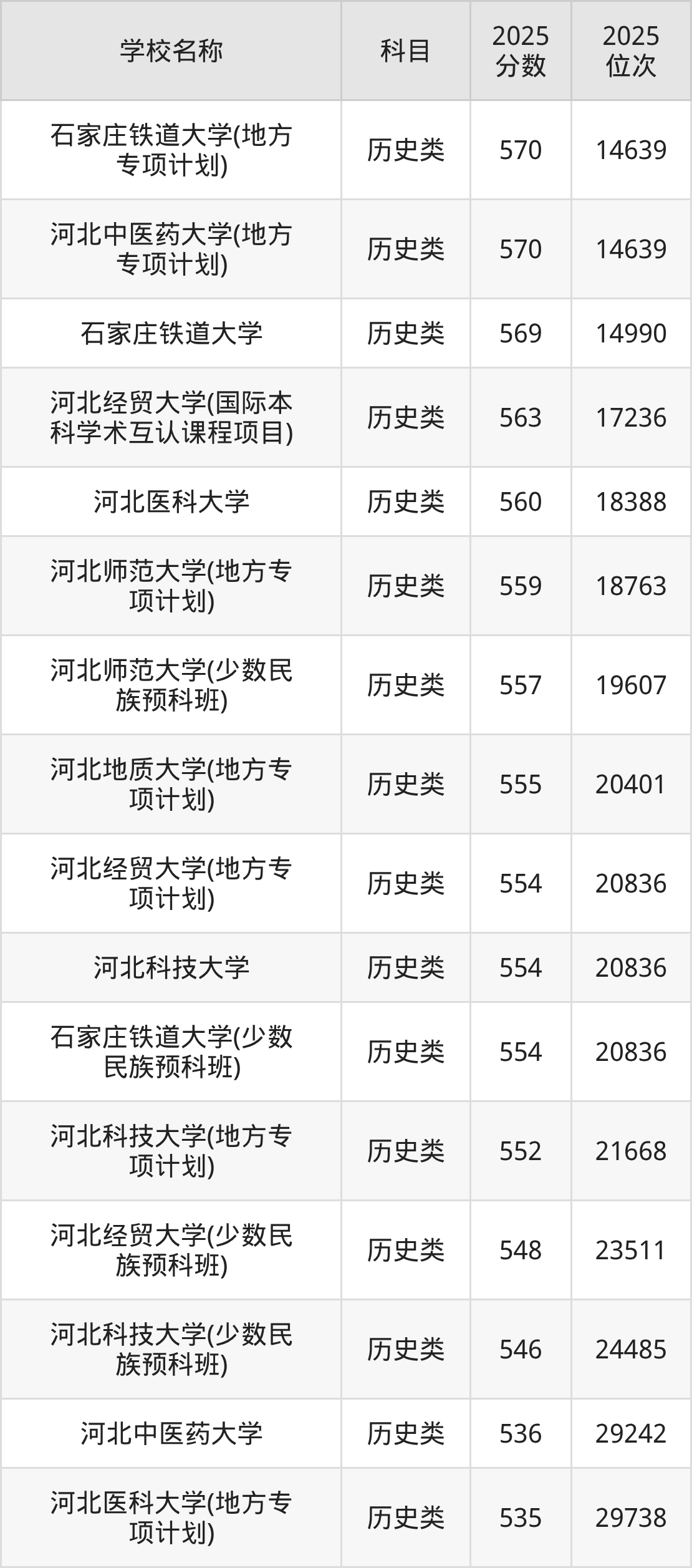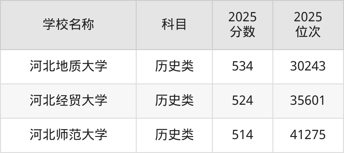 下文为2025年石家庄市含保研资格的大学在河北历史类录取分数线和位次排名表,供大家参考: