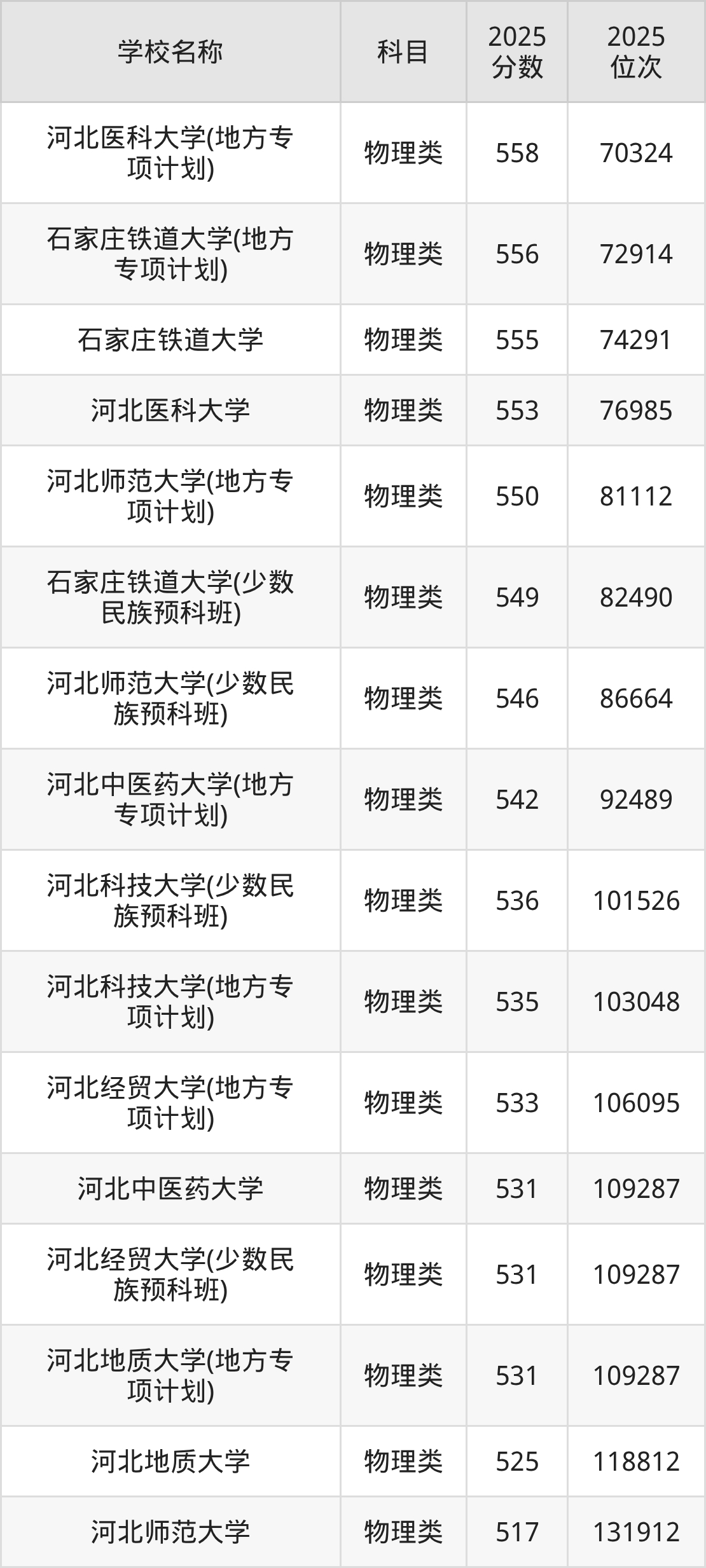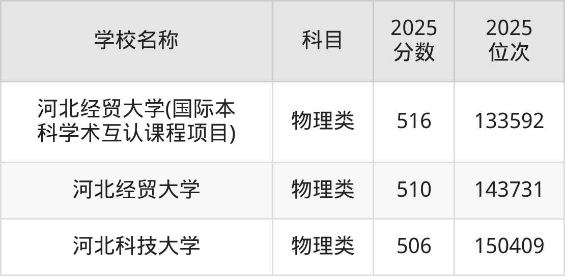 下文为2025年石家庄市含保研资格的大学在河北物理类录取分数线和位次排名表,供大家参考: