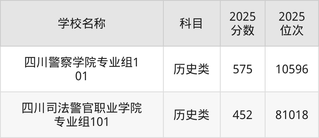 下文为2025年四川省公安警察大学在四川历史类录取分数线和位次排名表,供大家参考: