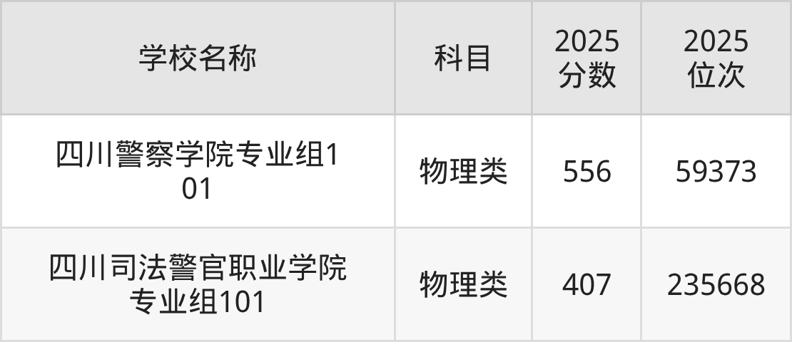 下文为2025年四川省公安警察大学在四川物理类录取分数线和位次排名表,供大家参考: