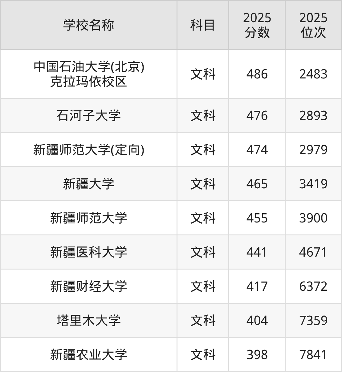 下文为2025年新疆维吾尔自治区一本大学在新疆文科录取分数线和位次排名表,供大家参考: