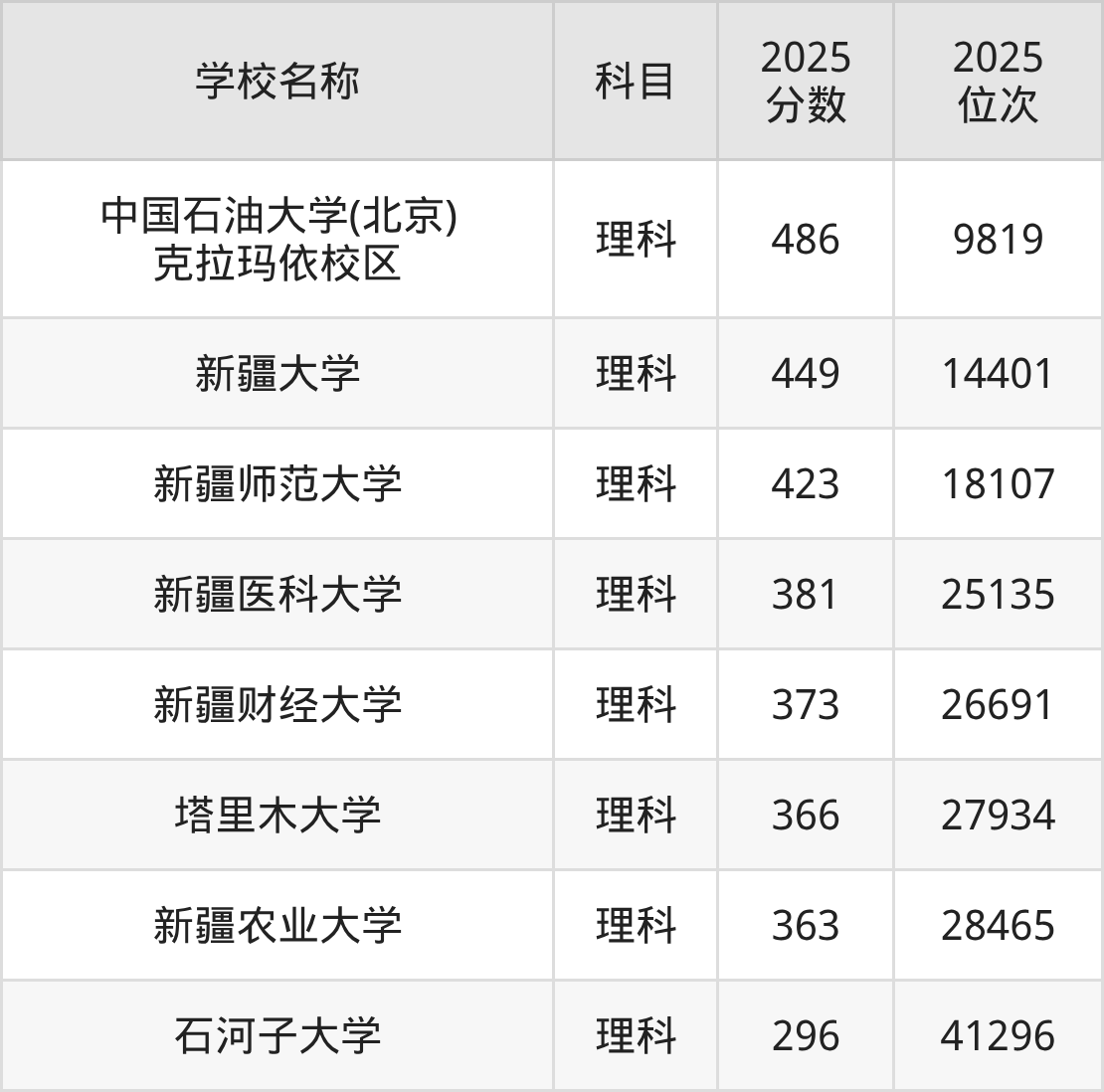 下文为2025年新疆维吾尔自治区一本大学在新疆理科录取分数线和位次排名表,供大家参考: