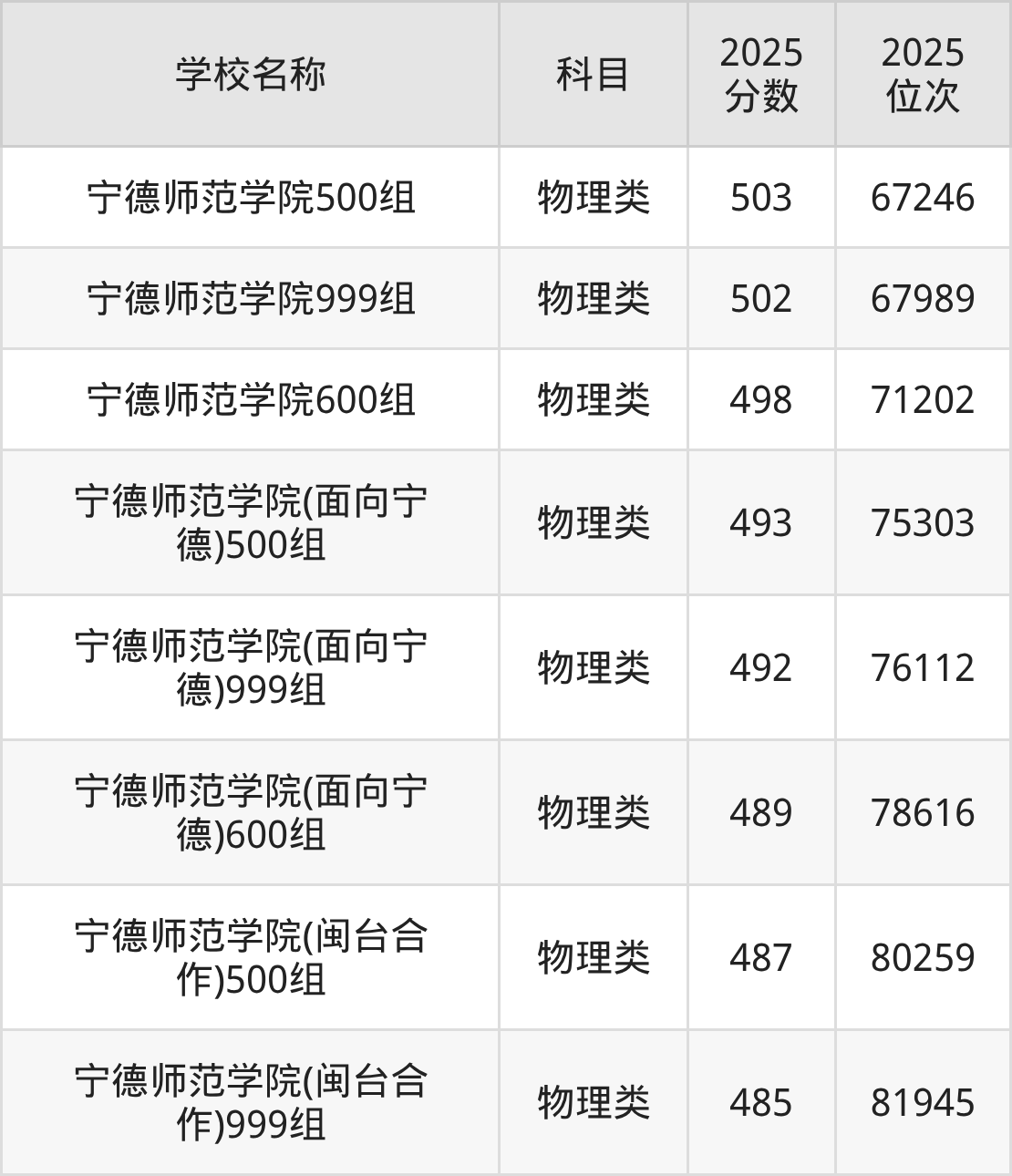 下文为2025年宁德市二本师范大学在福建物理类录取分数线和位次排名表,供大家参考: