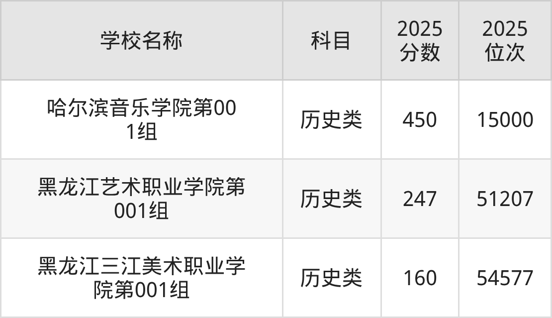 下文为2025年黑龙江省艺术类大学在黑龙江历史类录取分数线和位次排名表,供大家参考: