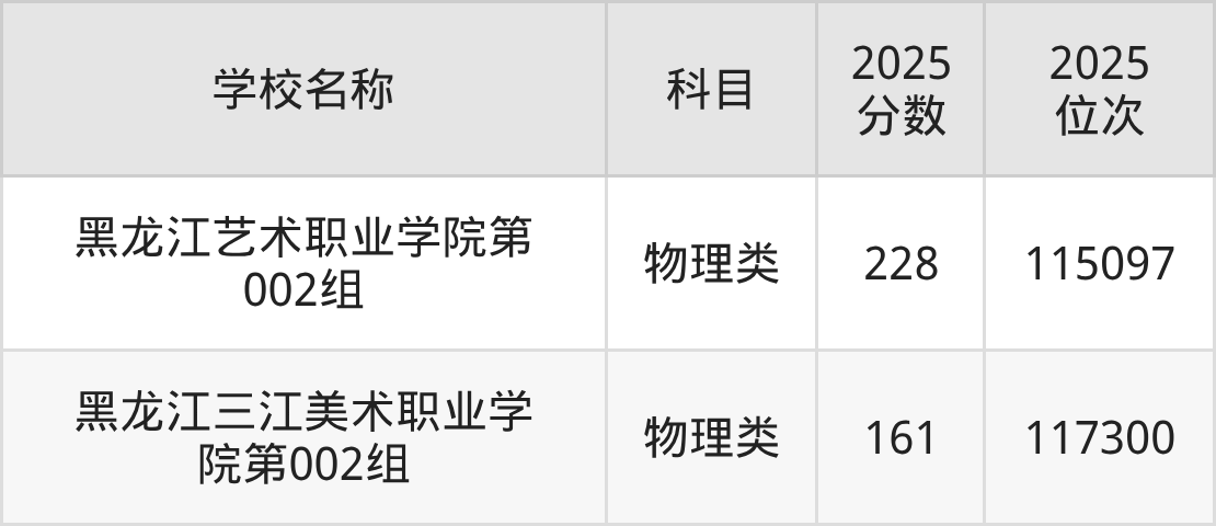 下文为2025年黑龙江省艺术类大学在黑龙江物理类录取分数线和位次排名表,供大家参考: