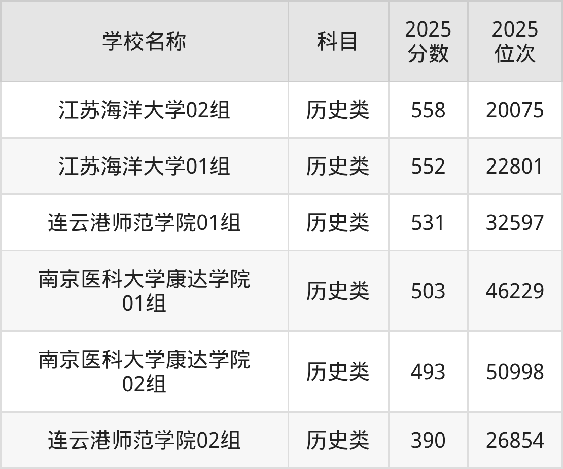 下文为2025年连云港市本科大学在江苏历史类录取分数线和位次排名表,供大家参考: