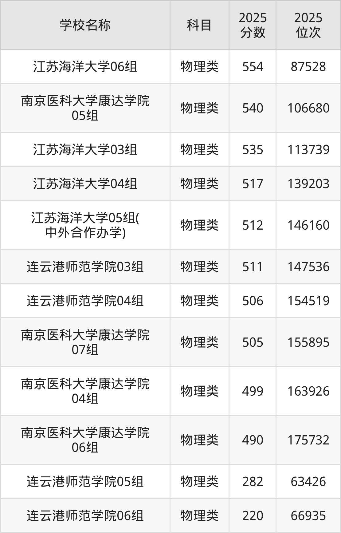 下文为2025年连云港市本科大学在江苏物理类录取分数线和位次排名表,供大家参考: