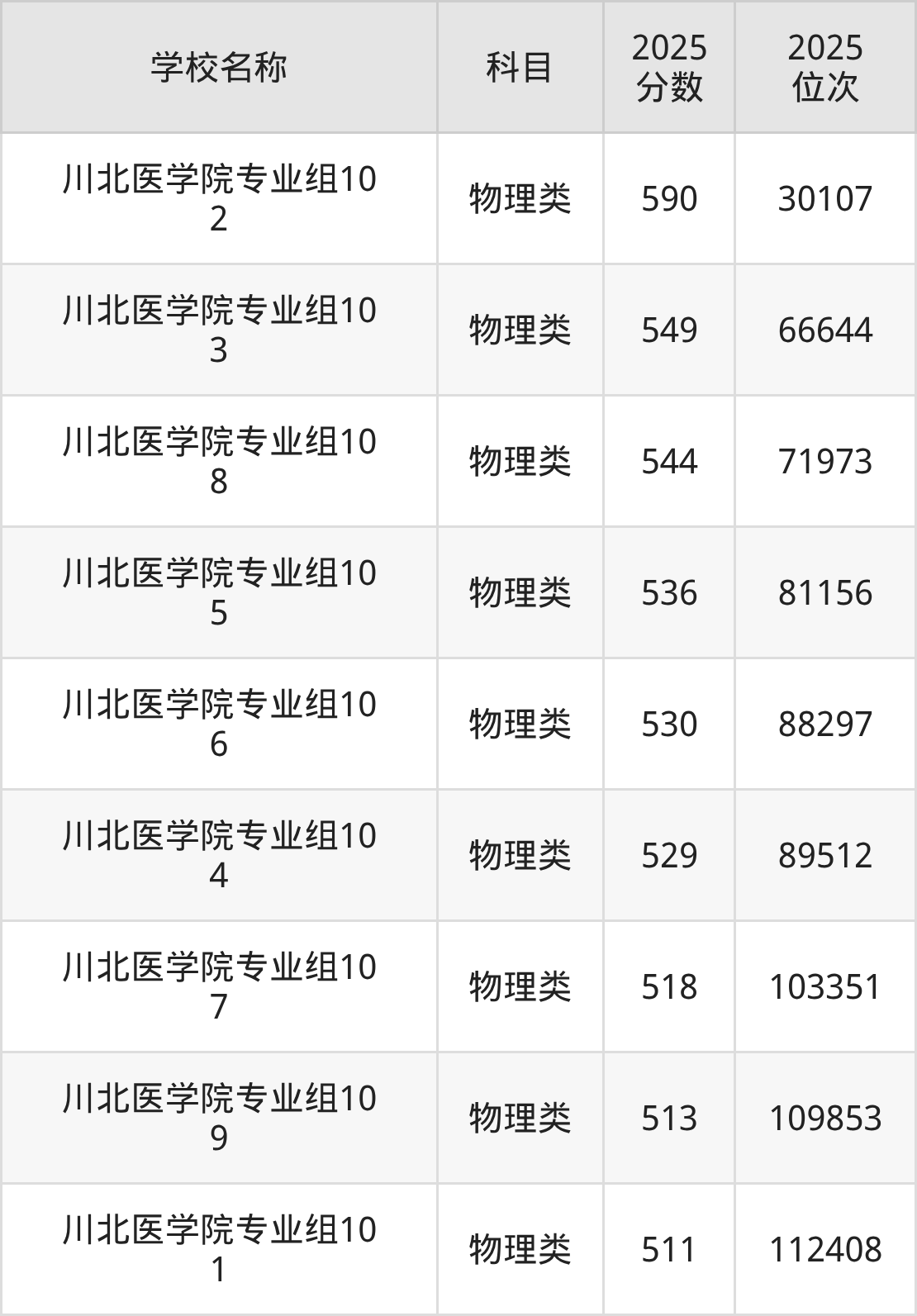 下文为2025年南充市医科大学在四川物理类录取分数线和位次排名表,供大家参考: