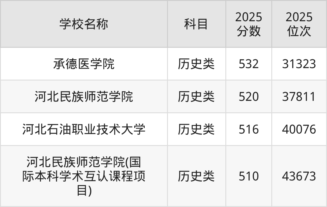 下文为2025年承德市公办二本大学在河北历史类录取分数线和位次排名表,供大家参考: