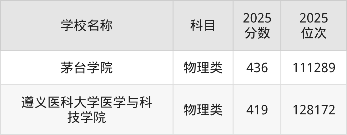 下文为2025年遵义市民办二本大学在贵州物理类录取分数线和位次排名表,供大家参考:
