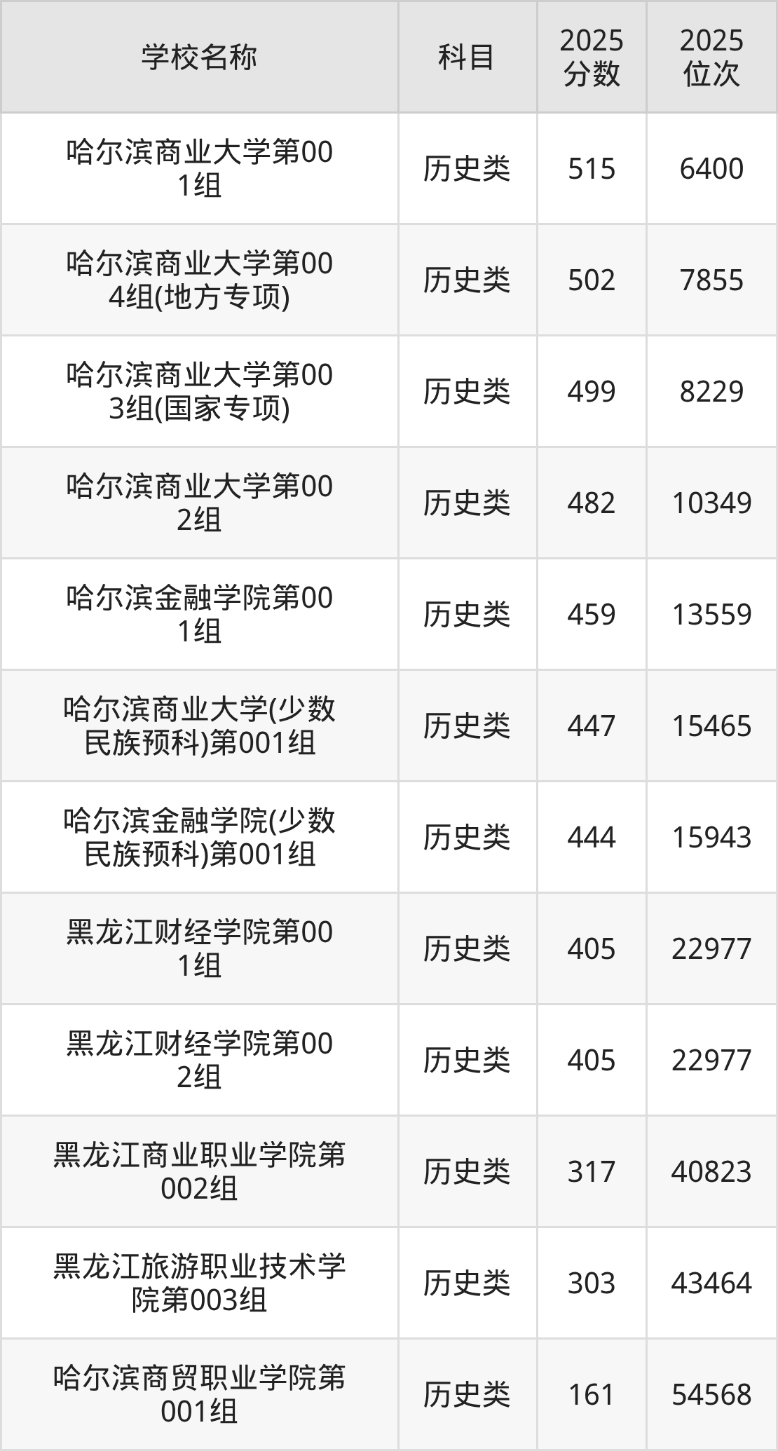 下文为2025年黑龙江省财经类大学在黑龙江历史类录取分数线和位次排名表,供大家参考: