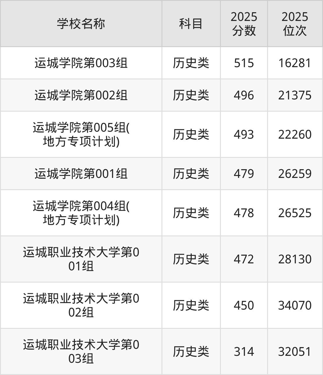 下文为2025年运城市综合类大学在山西历史类录取分数线和位次排名表,供大家参考: