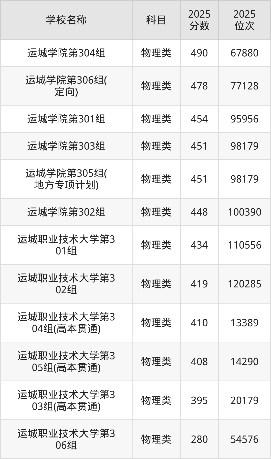 下文为2025年运城市综合类大学在山西物理类录取分数线和位次排名表,供大家参考: