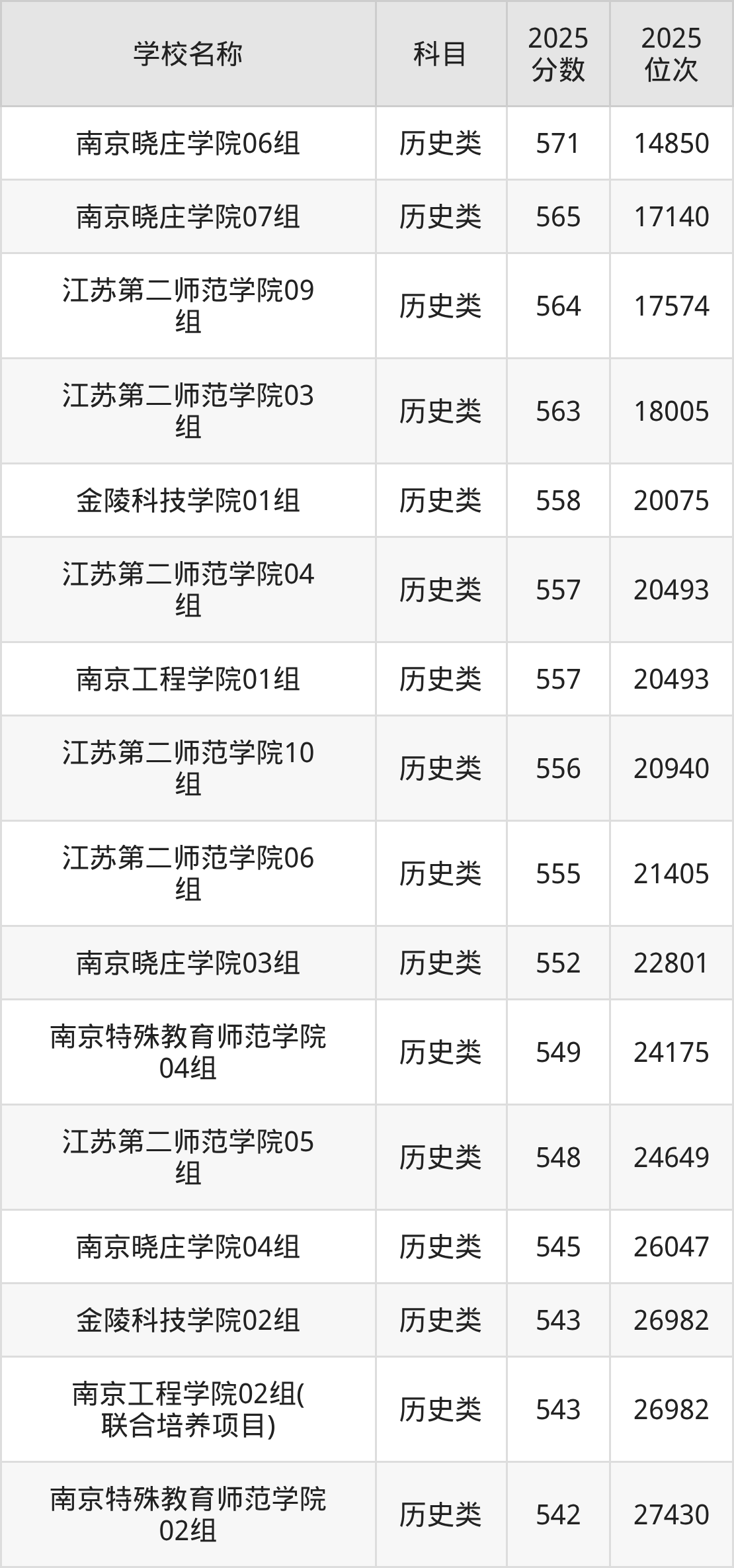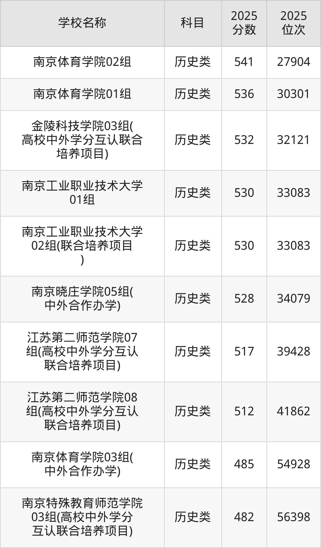 下文为2025年南京市公办二本大学在江苏历史类录取分数线和位次排名表,供大家参考: