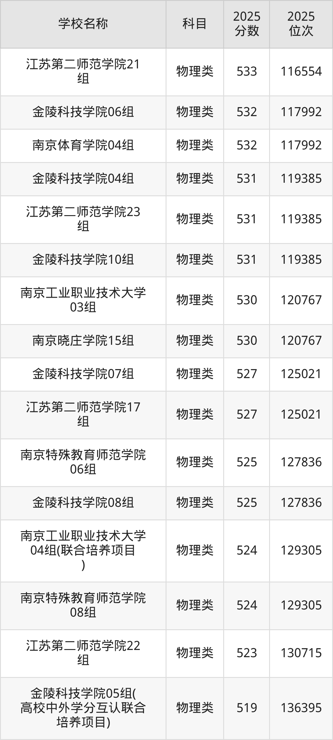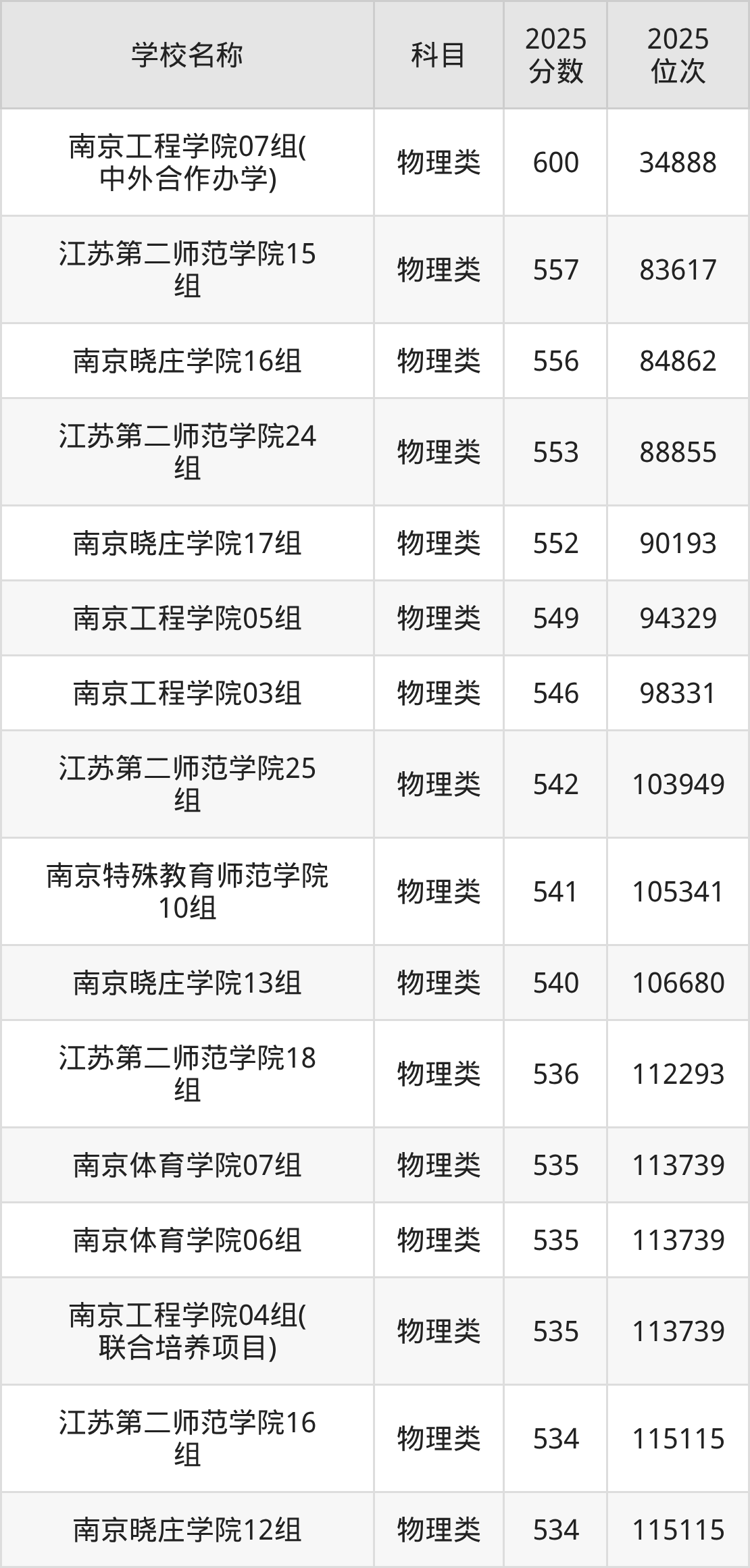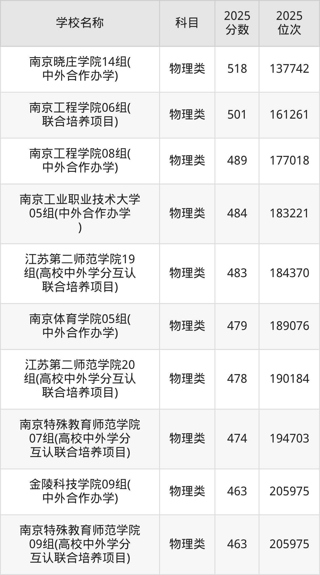 下文为2025年南京市公办二本大学在江苏物理类录取分数线和位次排名表,供大家参考: