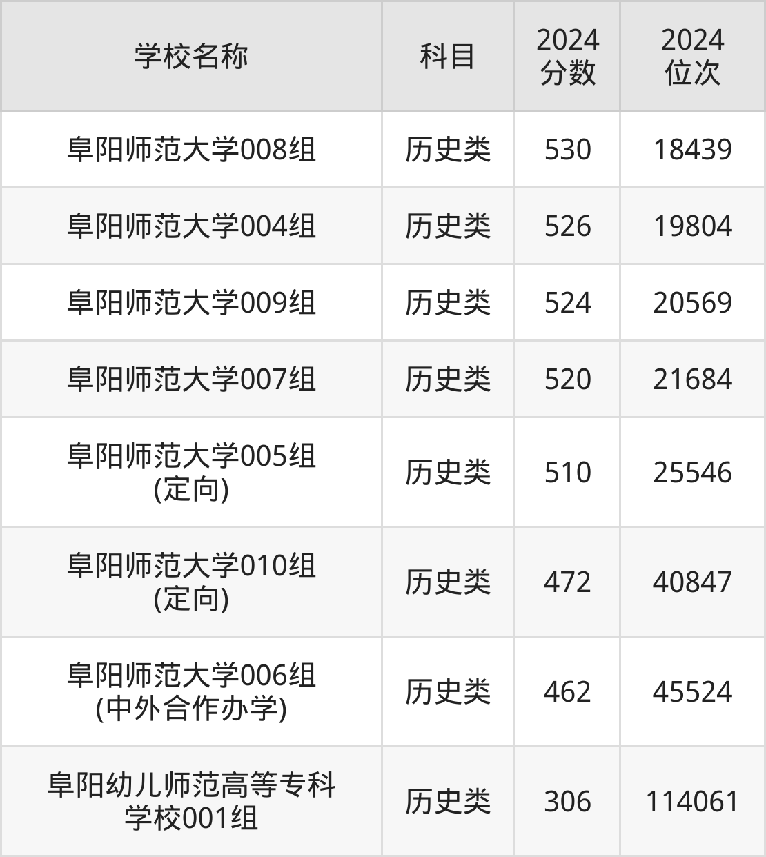 下文为2024年阜阳市师范类大学在安徽历史类录取分数线和位次排名表,供大家参考: