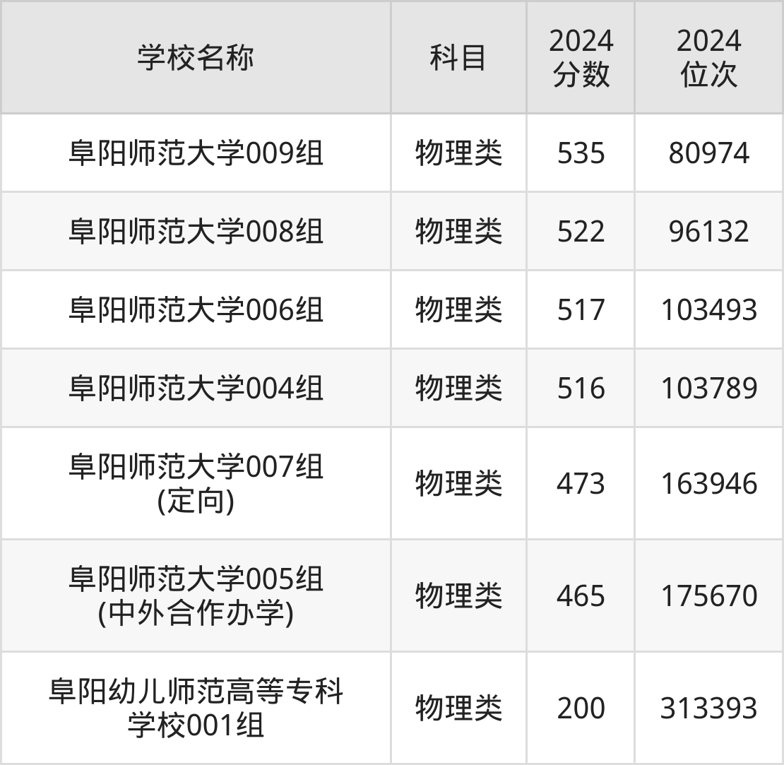 下文为2024年阜阳市师范类大学在安徽物理类录取分数线和位次排名表,供大家参考: