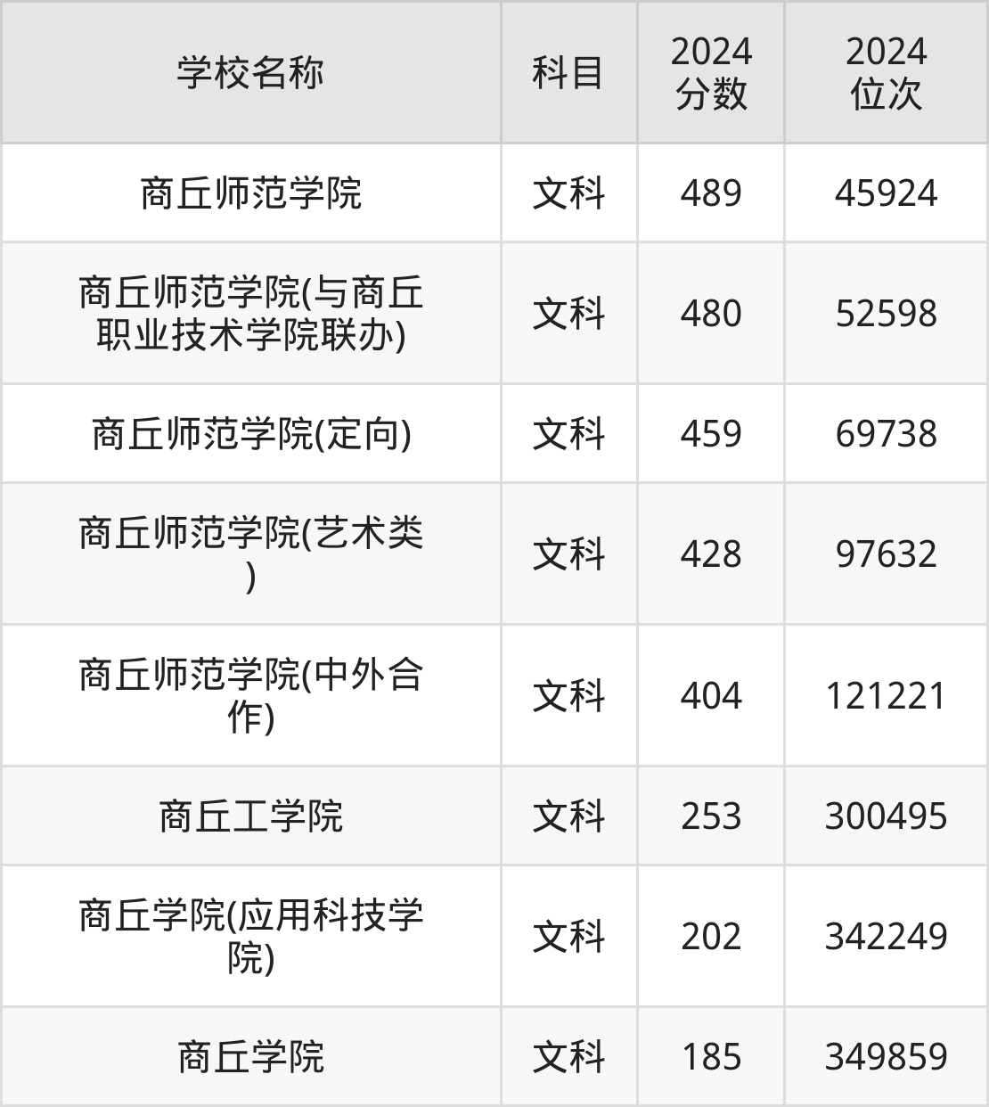 下文为2024年商丘市本科大学在河南文科录取分数线和位次排名表,供大家参考: