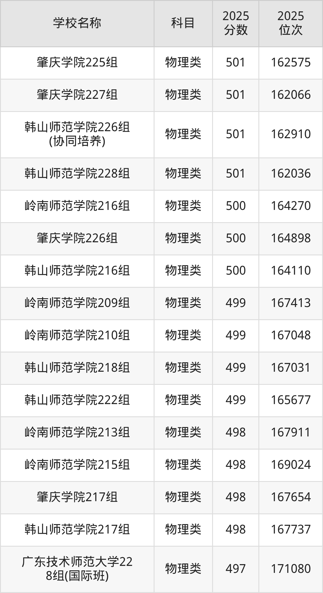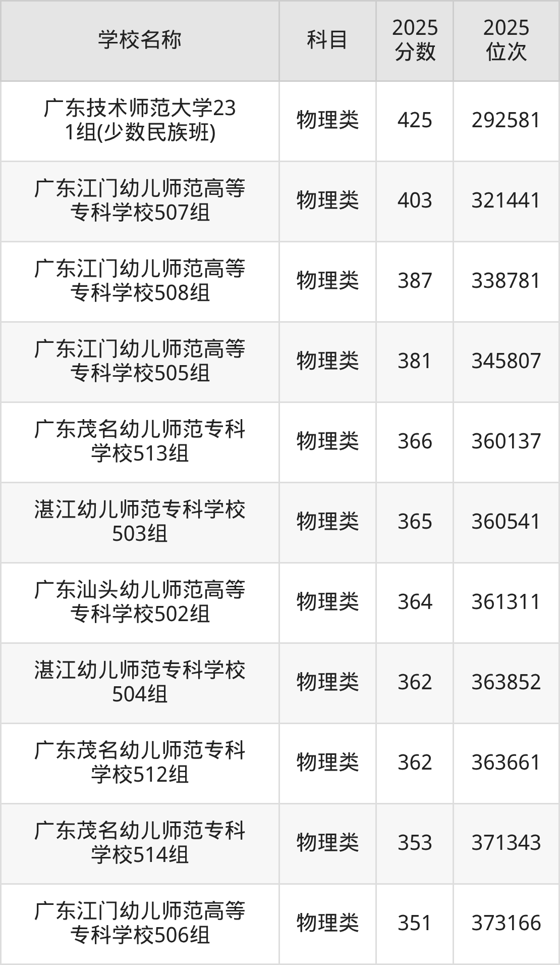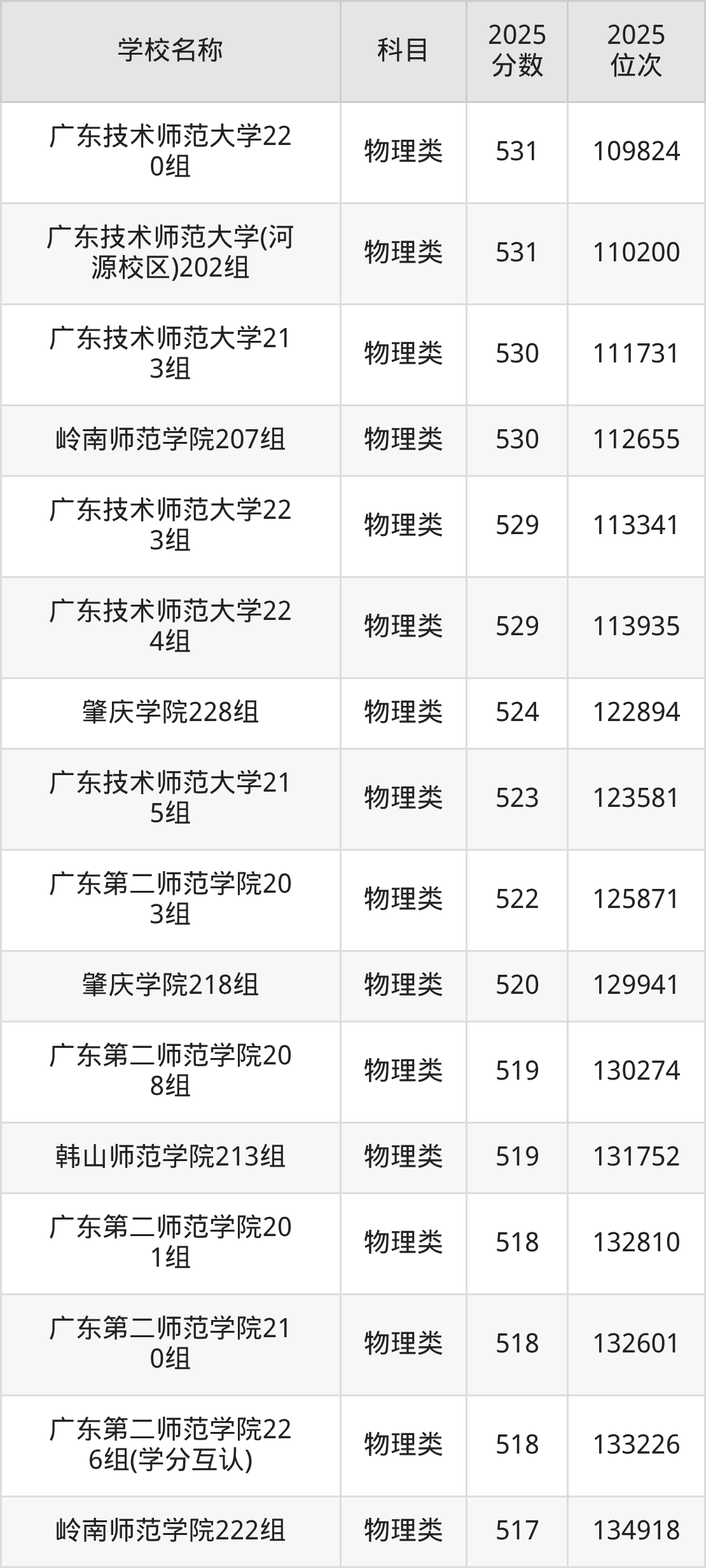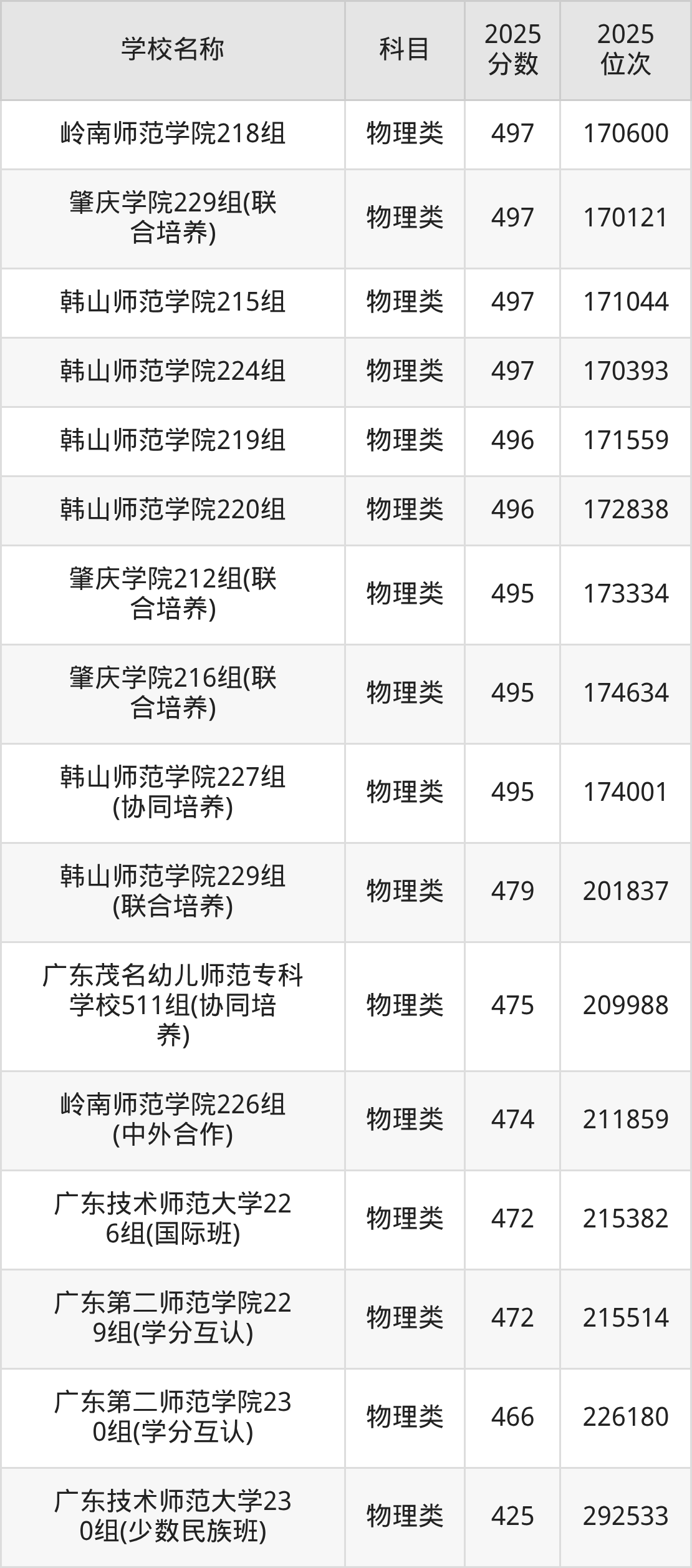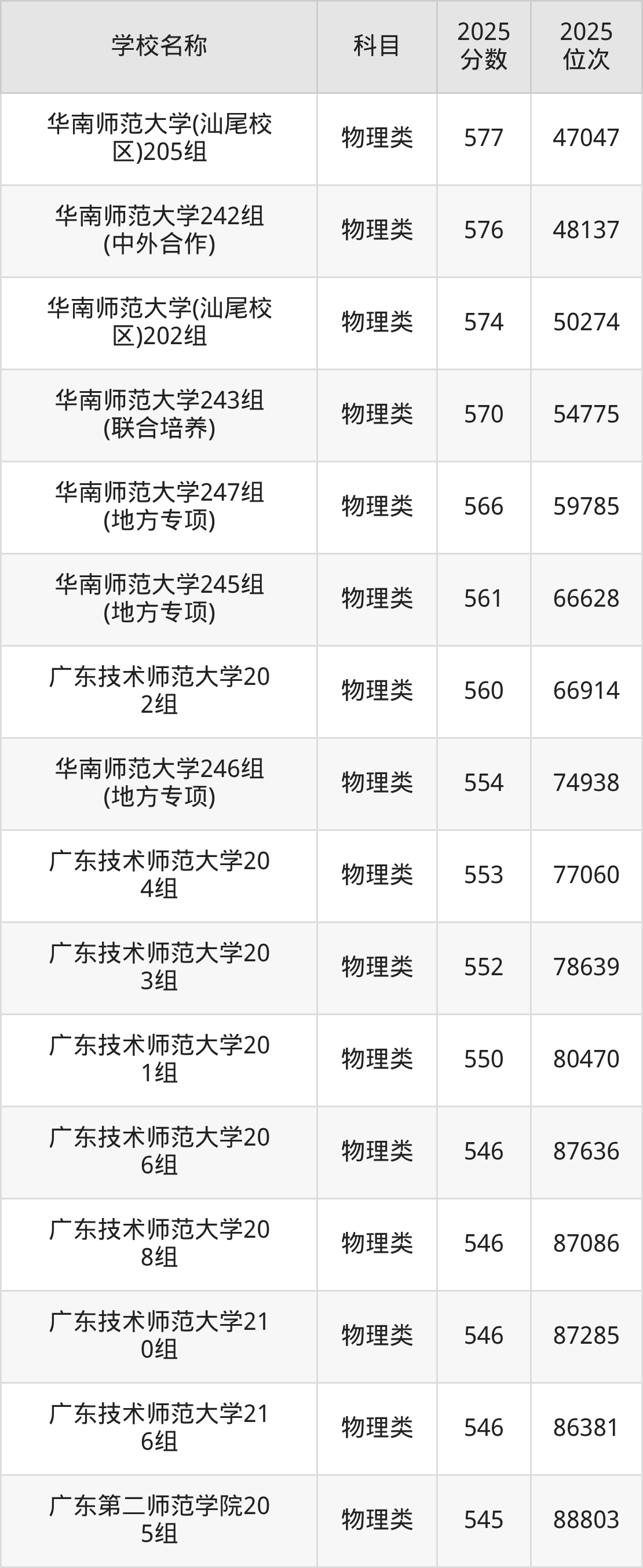 下文为2025年广东省师范类大学在广东物理类录取分数线和位次排名表,供大家参考: