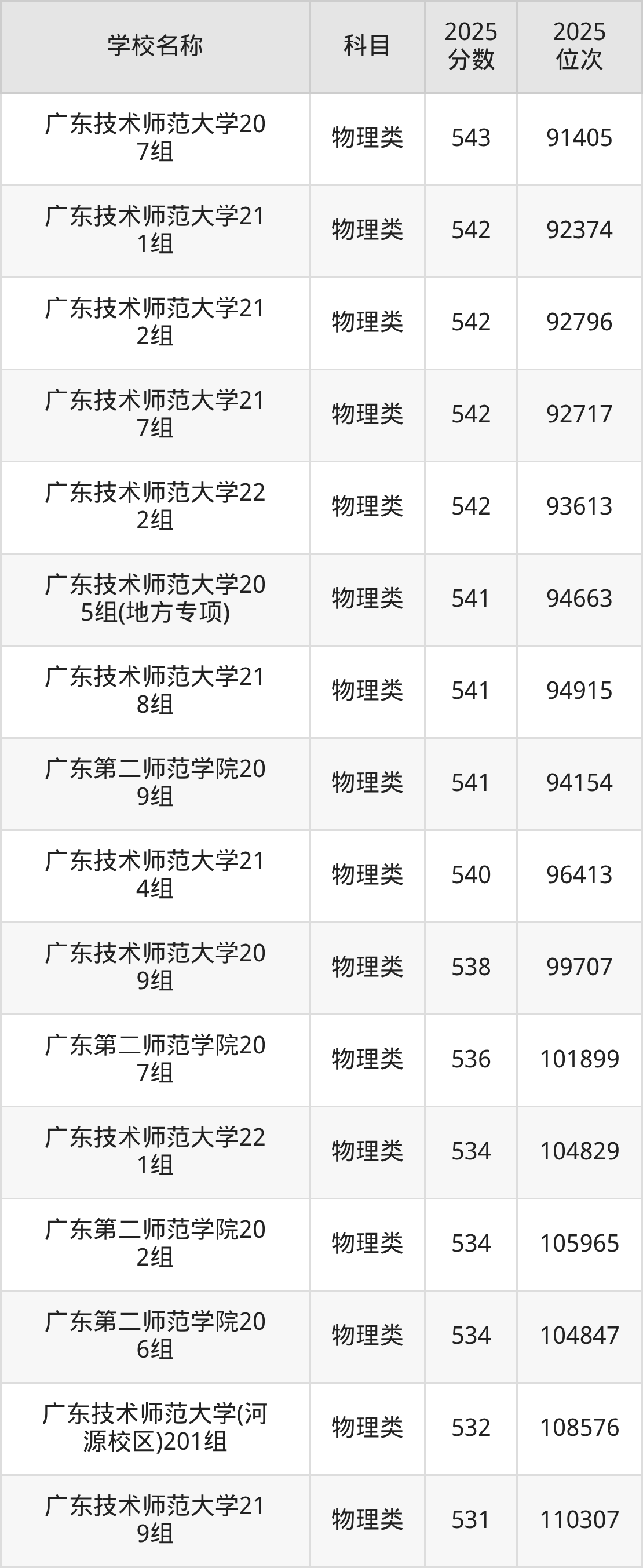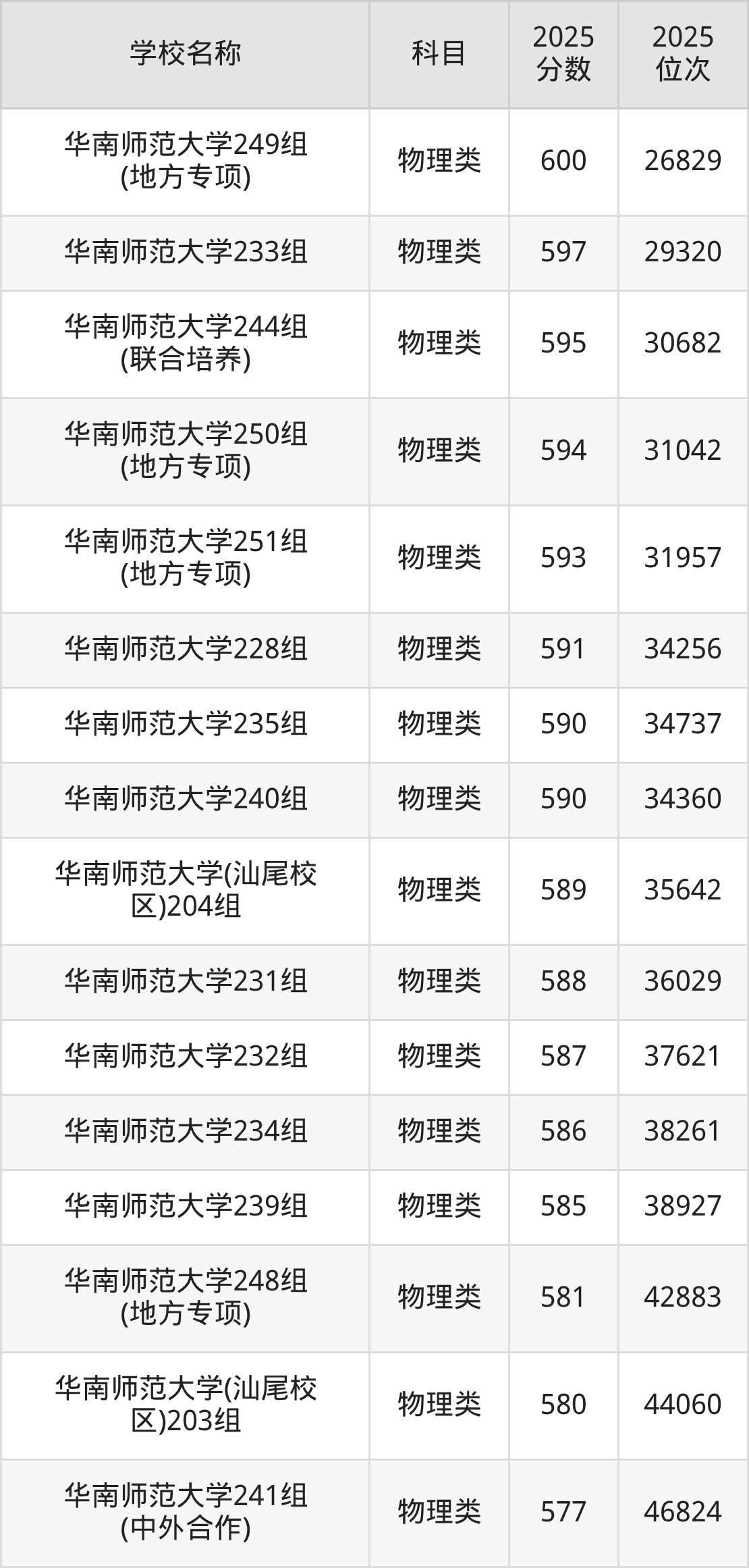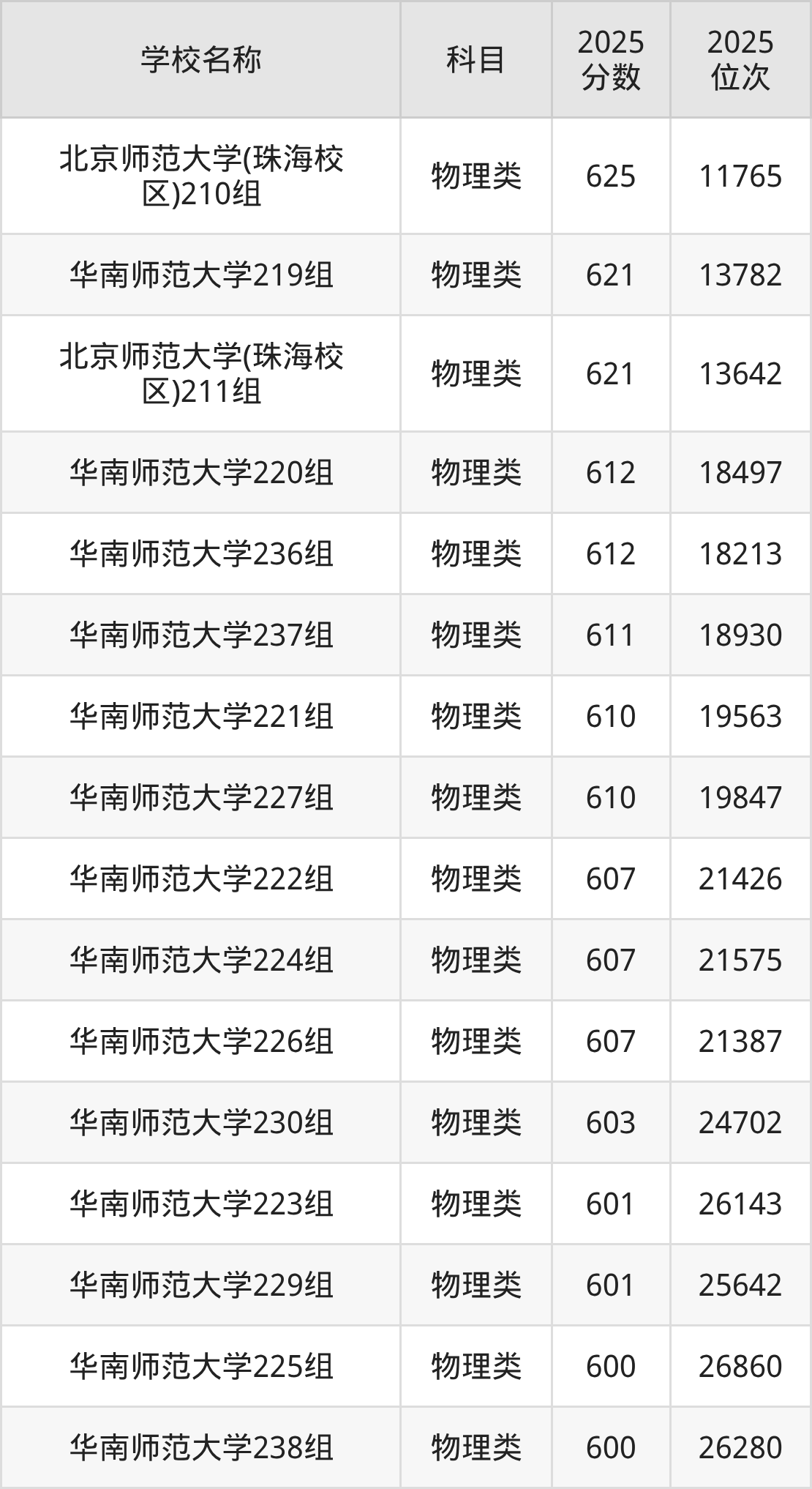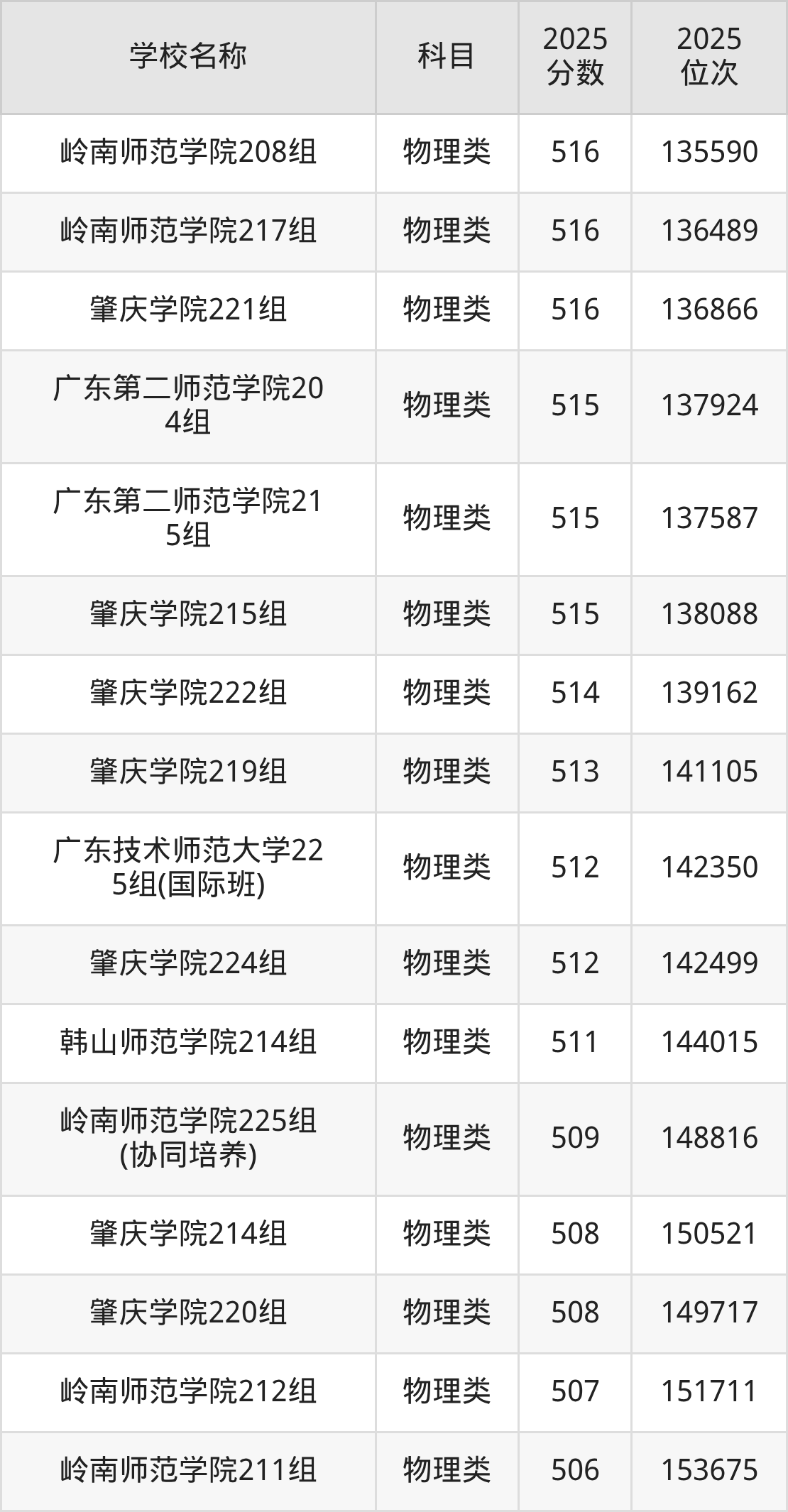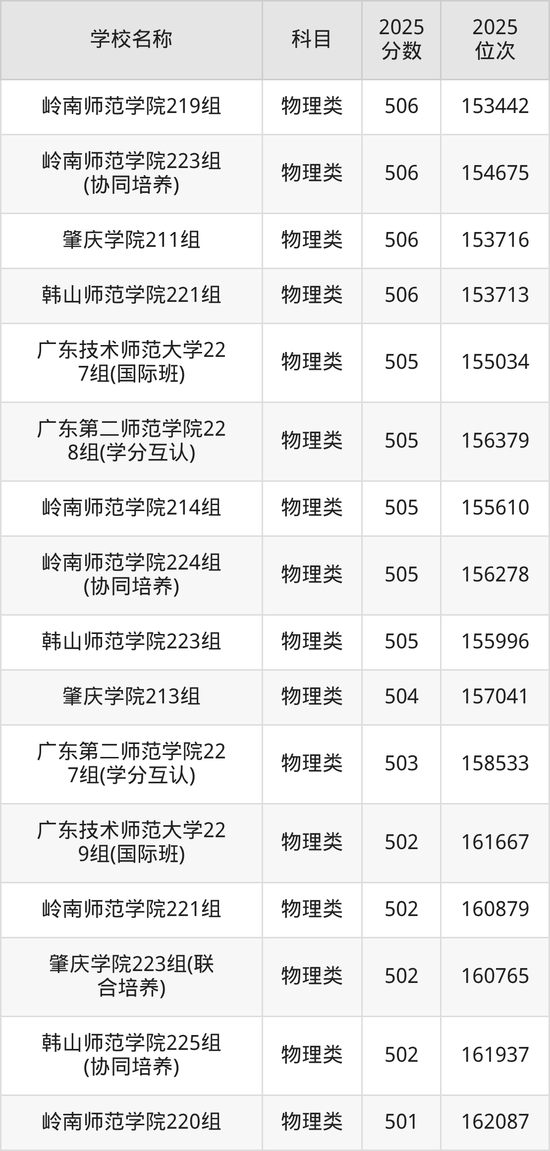下文为2025年广东省师范类大学在广东物理类录取分数线和位次排名表,供大家参考: