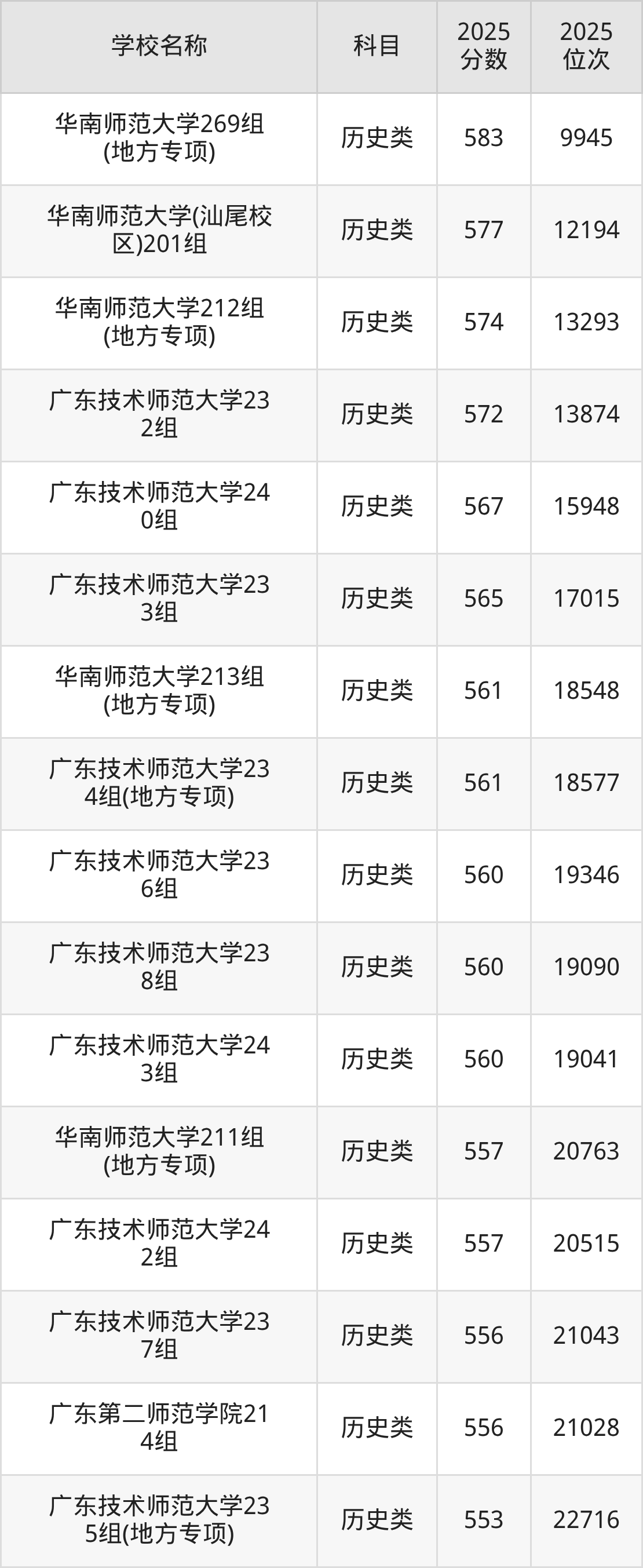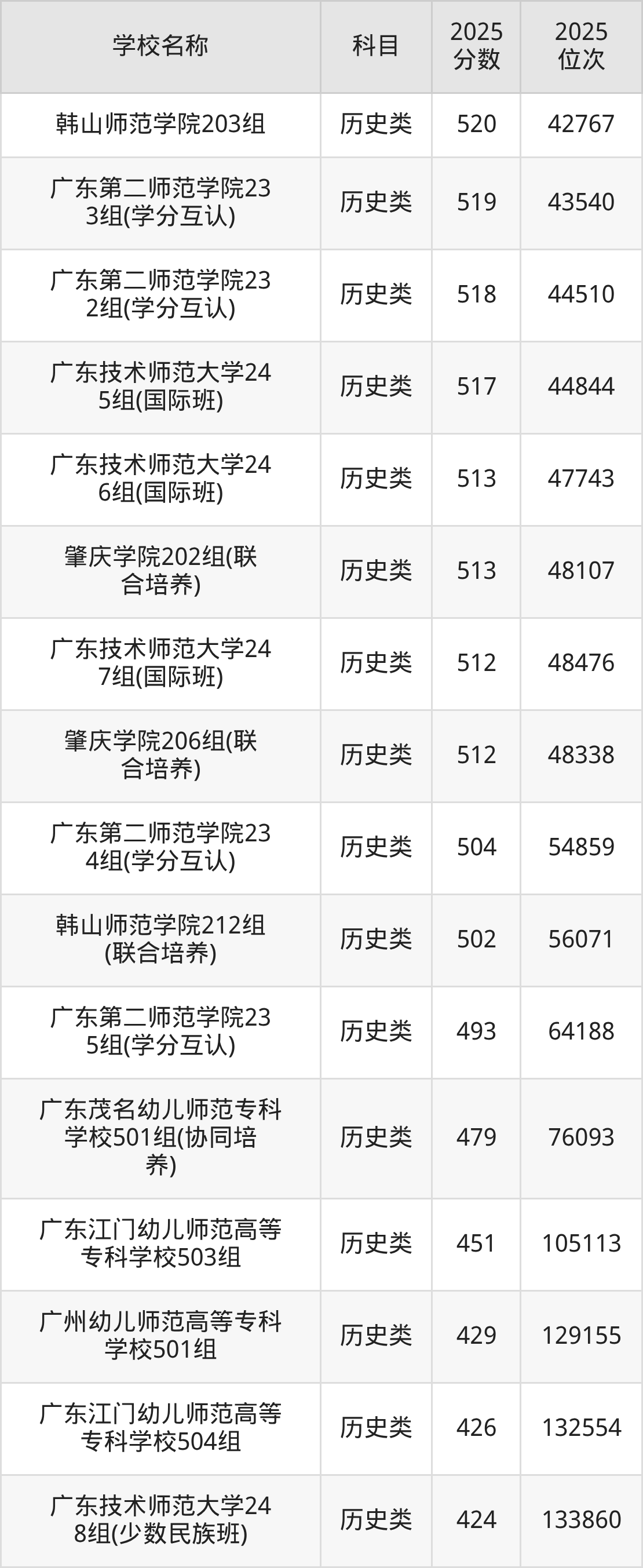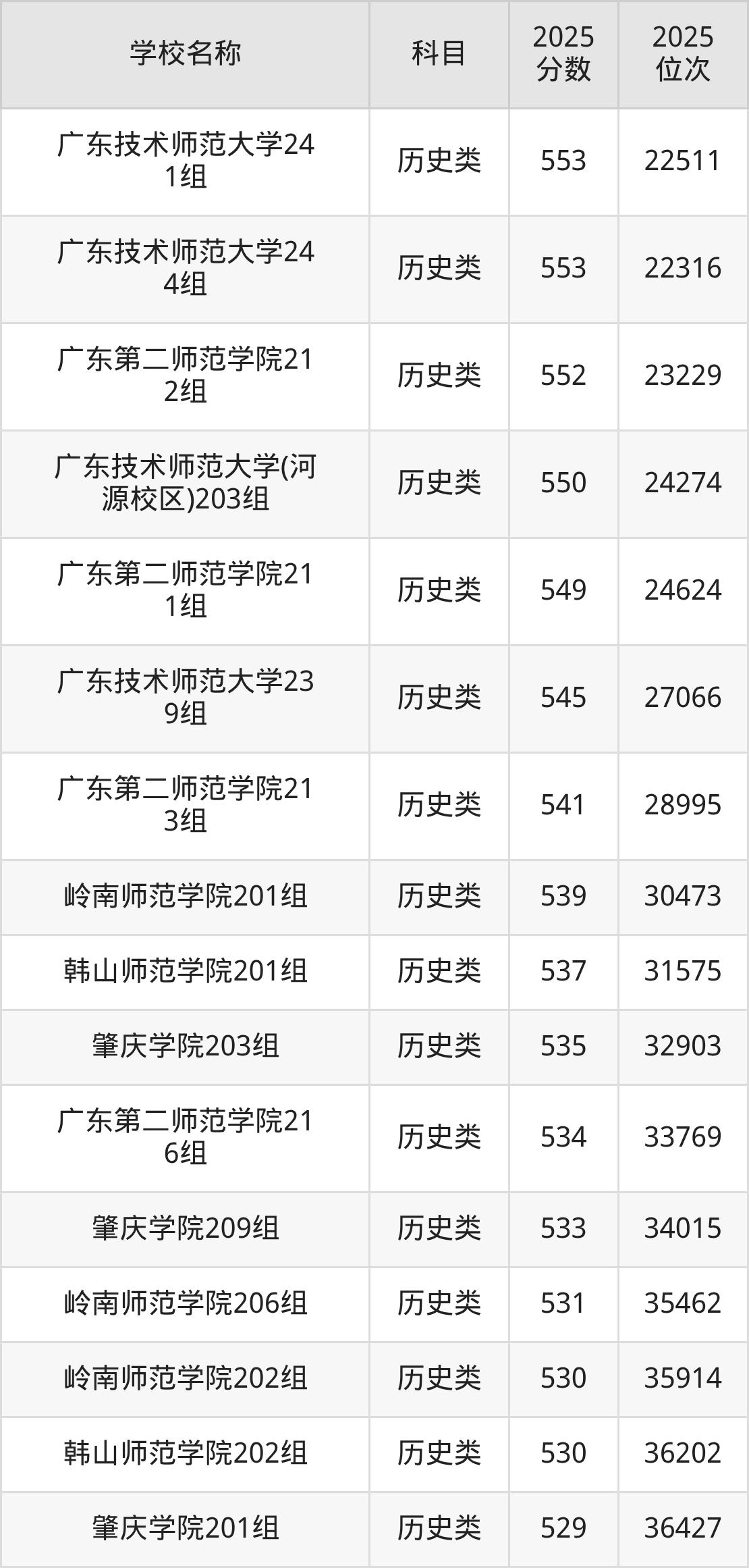 下文为2025年广东省师范类大学在广东历史类录取分数线和位次排名表,供大家参考: