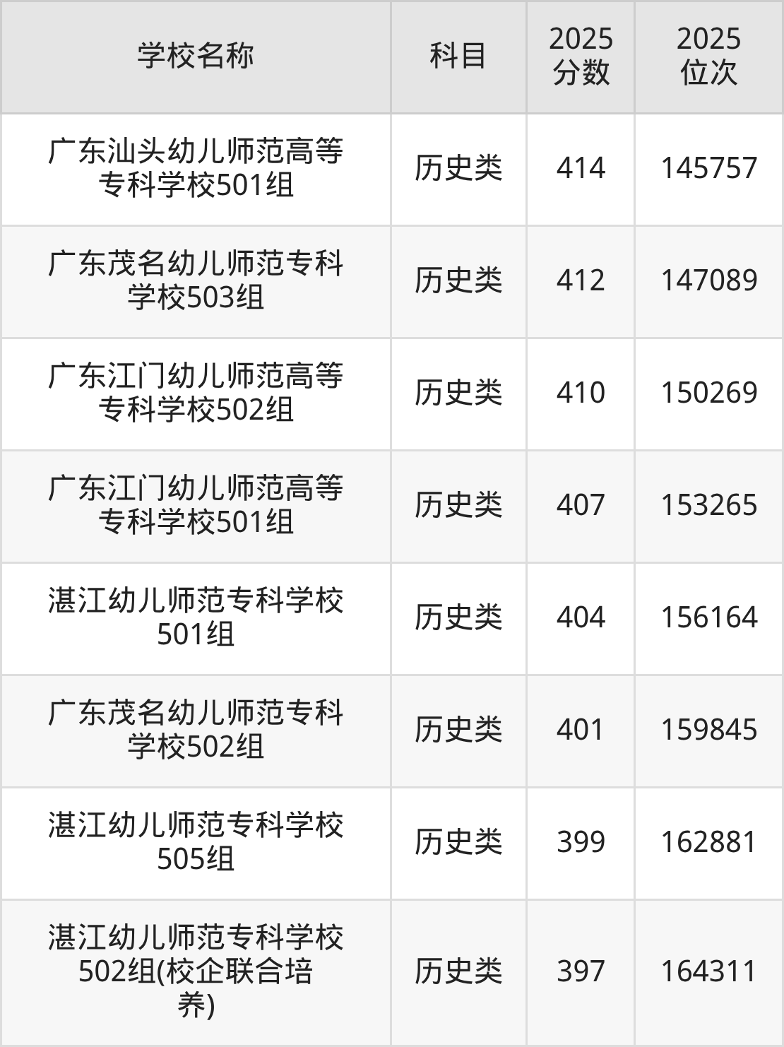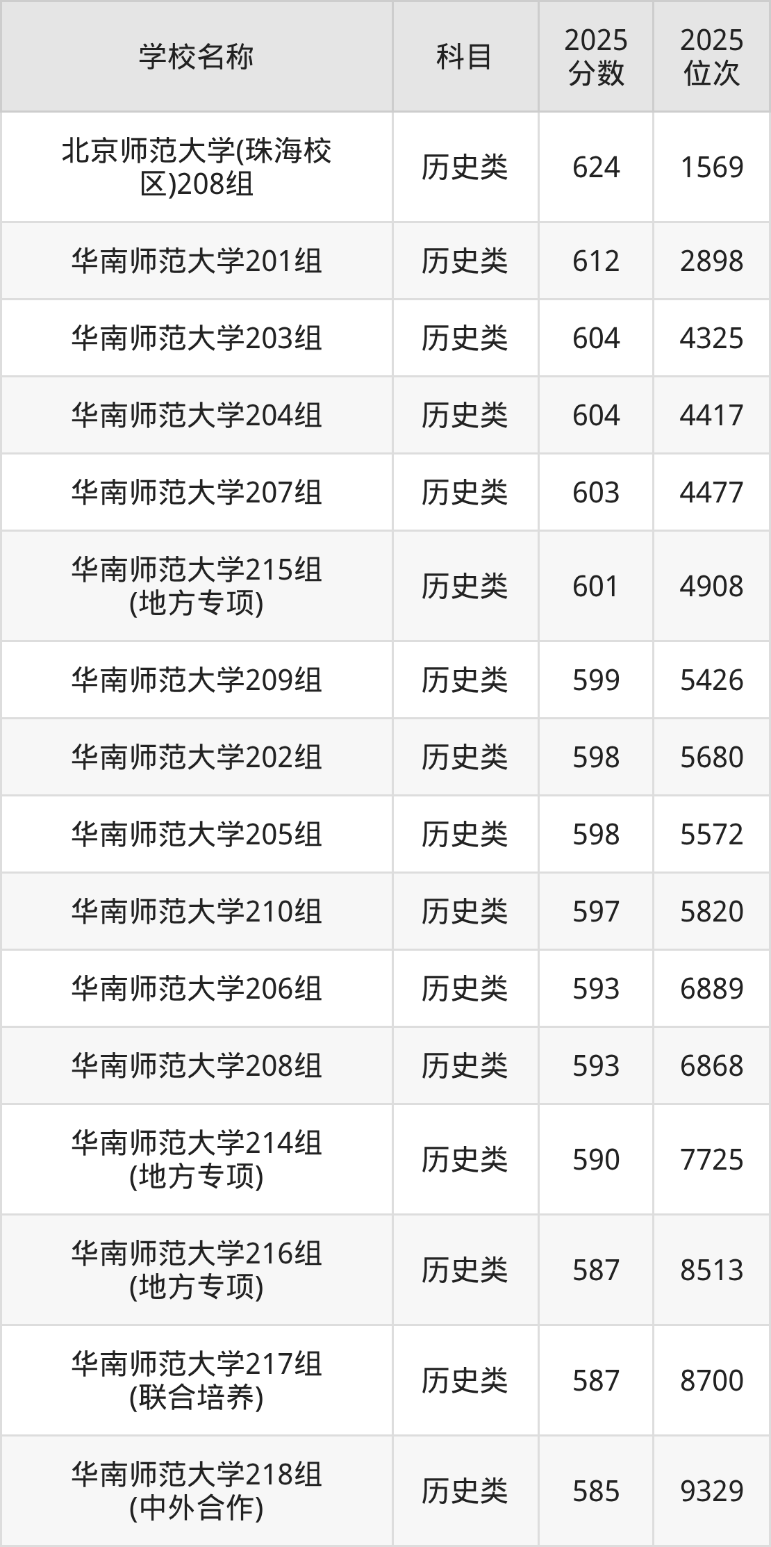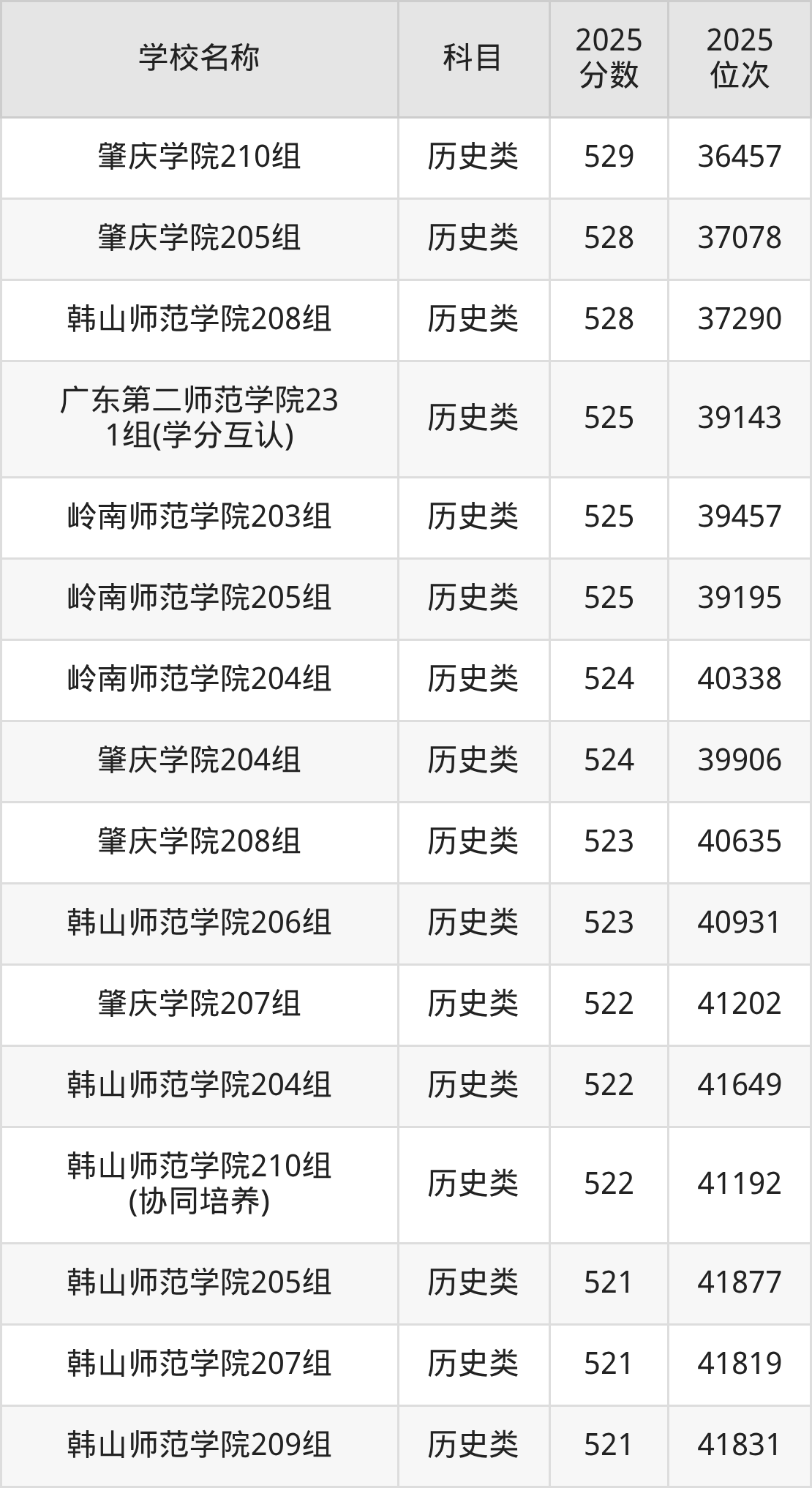 下文为2025年广东省师范类大学在广东历史类录取分数线和位次排名表,供大家参考: