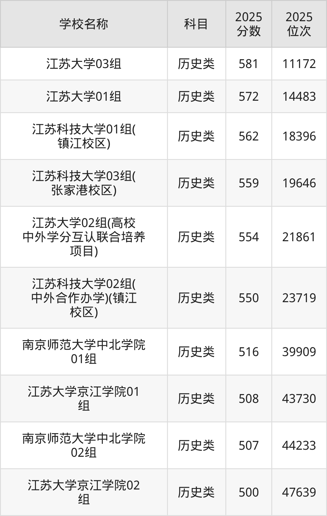 下文为2025年镇江市本科大学在江苏历史类录取分数线和位次排名表,供大家参考: