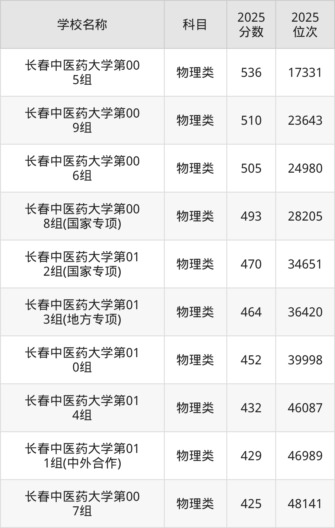 下文为2025年吉林省中医药大学在吉林物理类录取分数线和位次排名表,供大家参考: