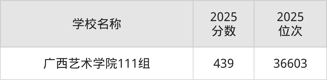 下文为2025年广西壮族自治区二本艺术大学在广西物理类录取分数线和位次排名表,供大家参考: