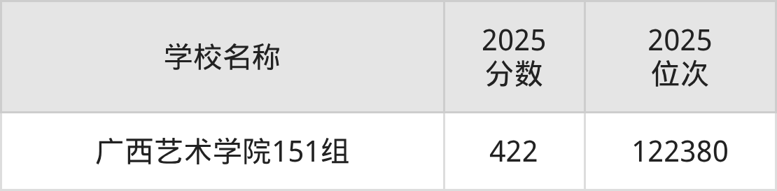 下文为2025年广西壮族自治区二本艺术大学在广西历史类录取分数线和位次排名表,供大家参考: