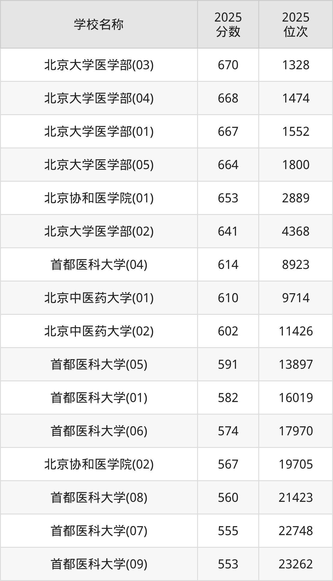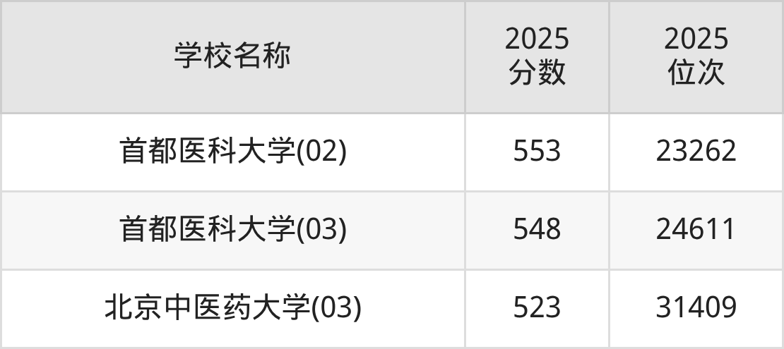 下文为2025年北京市医科大学在北京录取分数线和位次排名表,供大家参考: