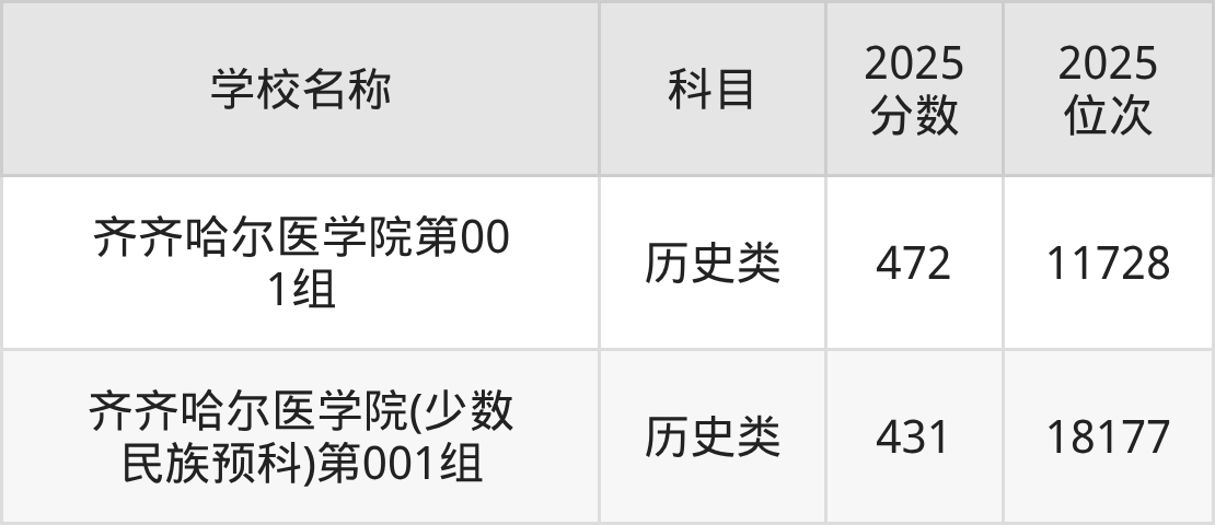 下文为2025年齐齐哈尔市公办二本大学在黑龙江历史类录取分数线和位次排名表,供大家参考: