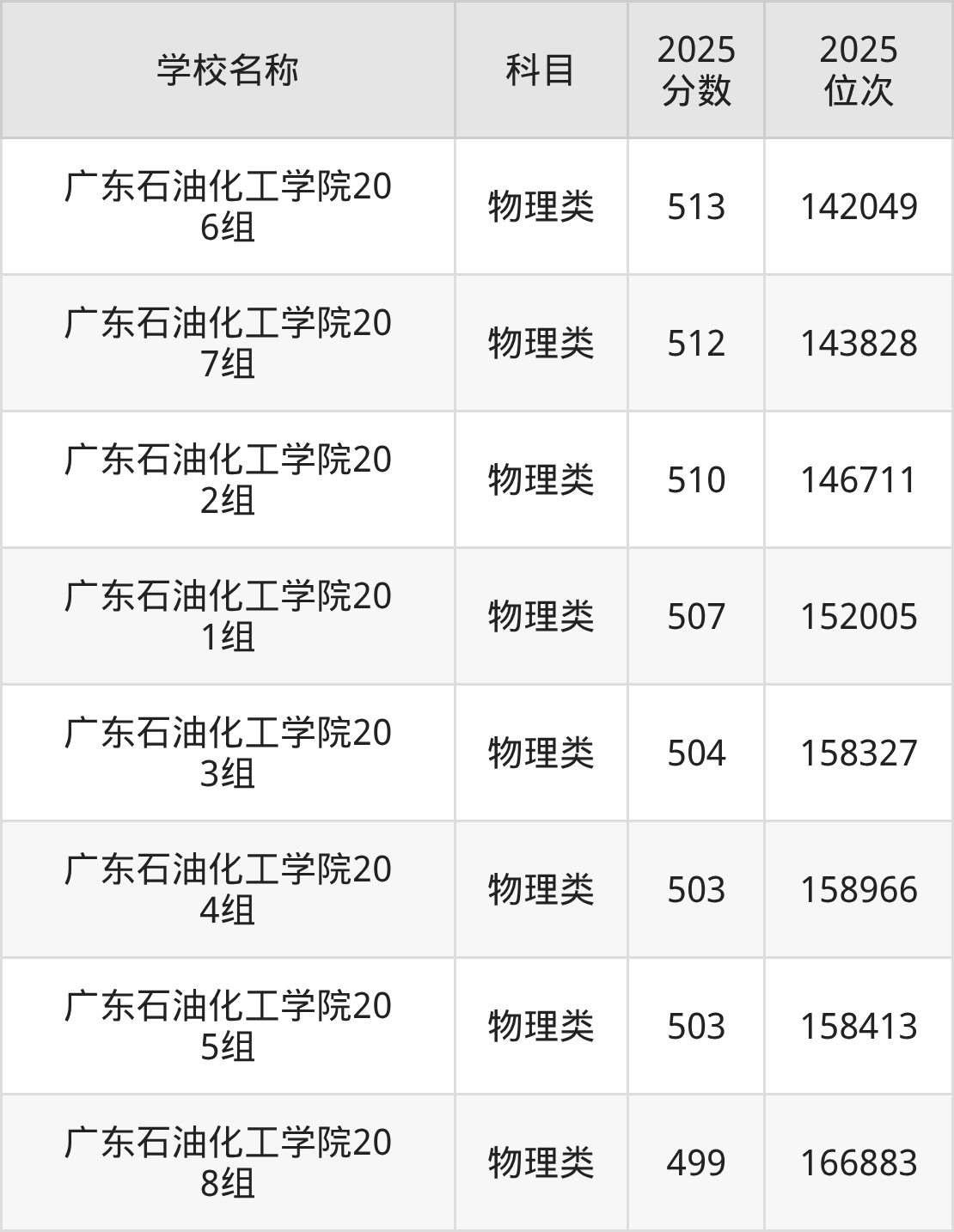 下文为2025年茂名市本科大学在广东物理类录取分数线和位次排名表,供大家参考: