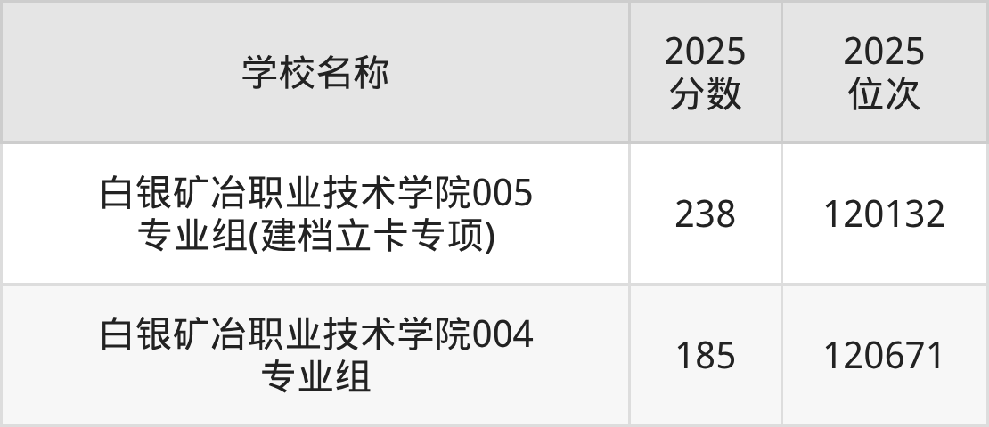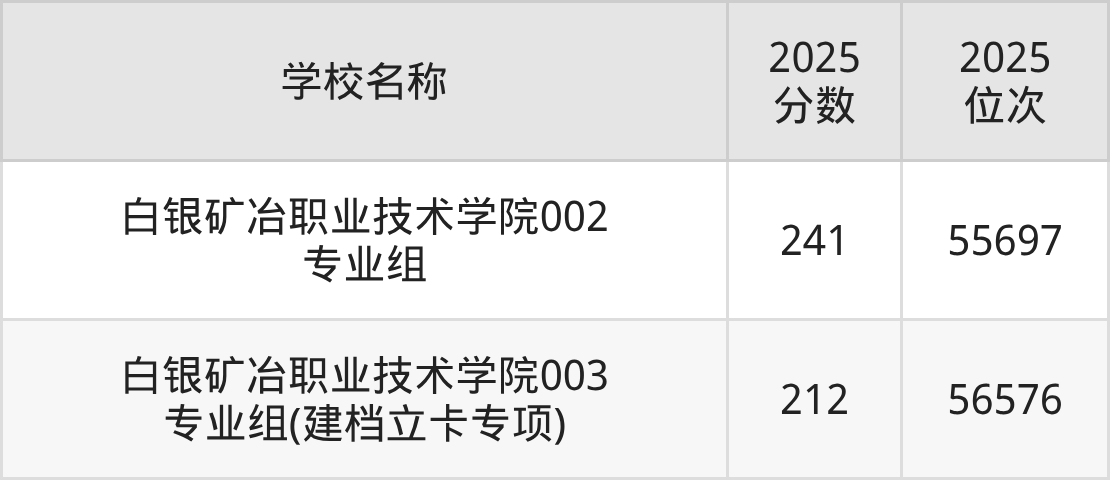 下文为2025年白银市公办专科大学在甘肃历史类录取分数线和位次排名表,供大家参考: