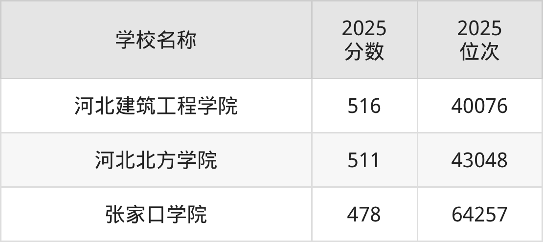 下文为2025年张家口市本科大学在河北历史类录取分数线和位次排名表,供大家参考: