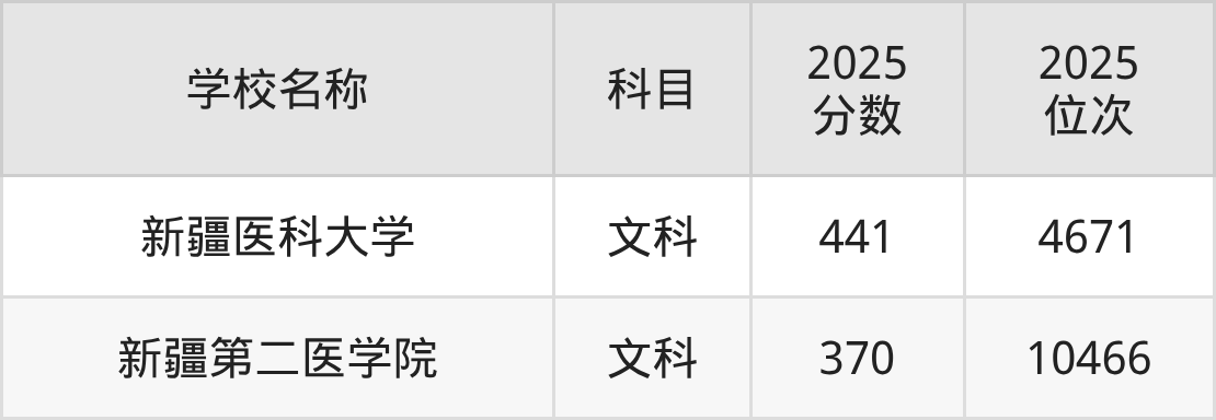 下文为2025年新疆维吾尔自治区二本医科大学在新疆文科录取分数线和位次排名表,供大家参考: