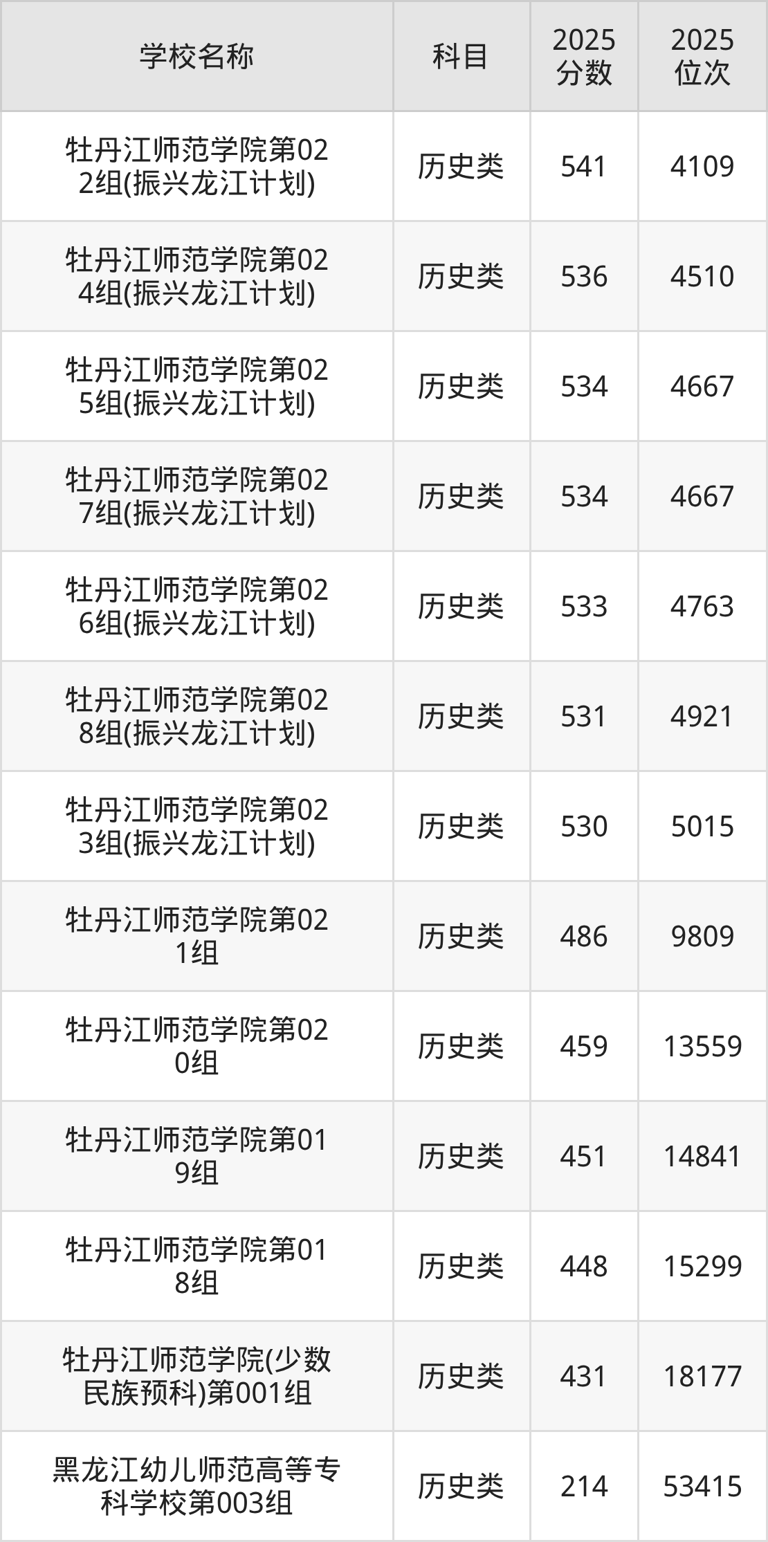 下文为2025年牡丹江市师范类大学在黑龙江历史类录取分数线和位次排名表,供大家参考: