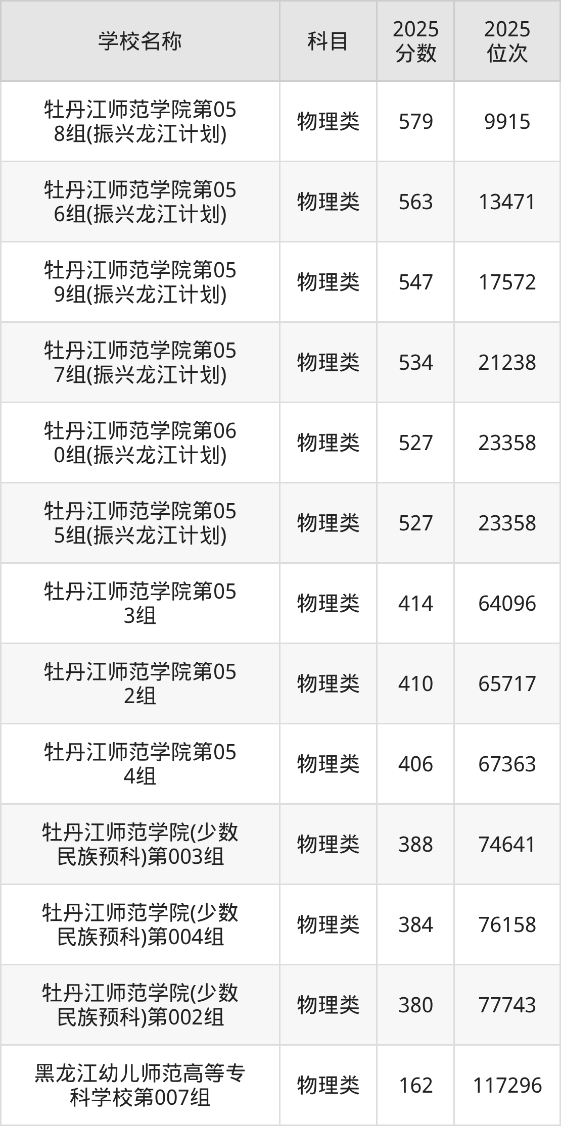 下文为2025年牡丹江市师范类大学在黑龙江物理类录取分数线和位次排名表,供大家参考:
