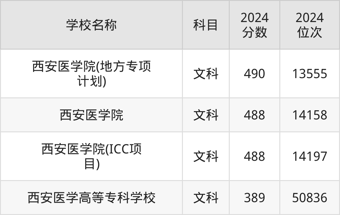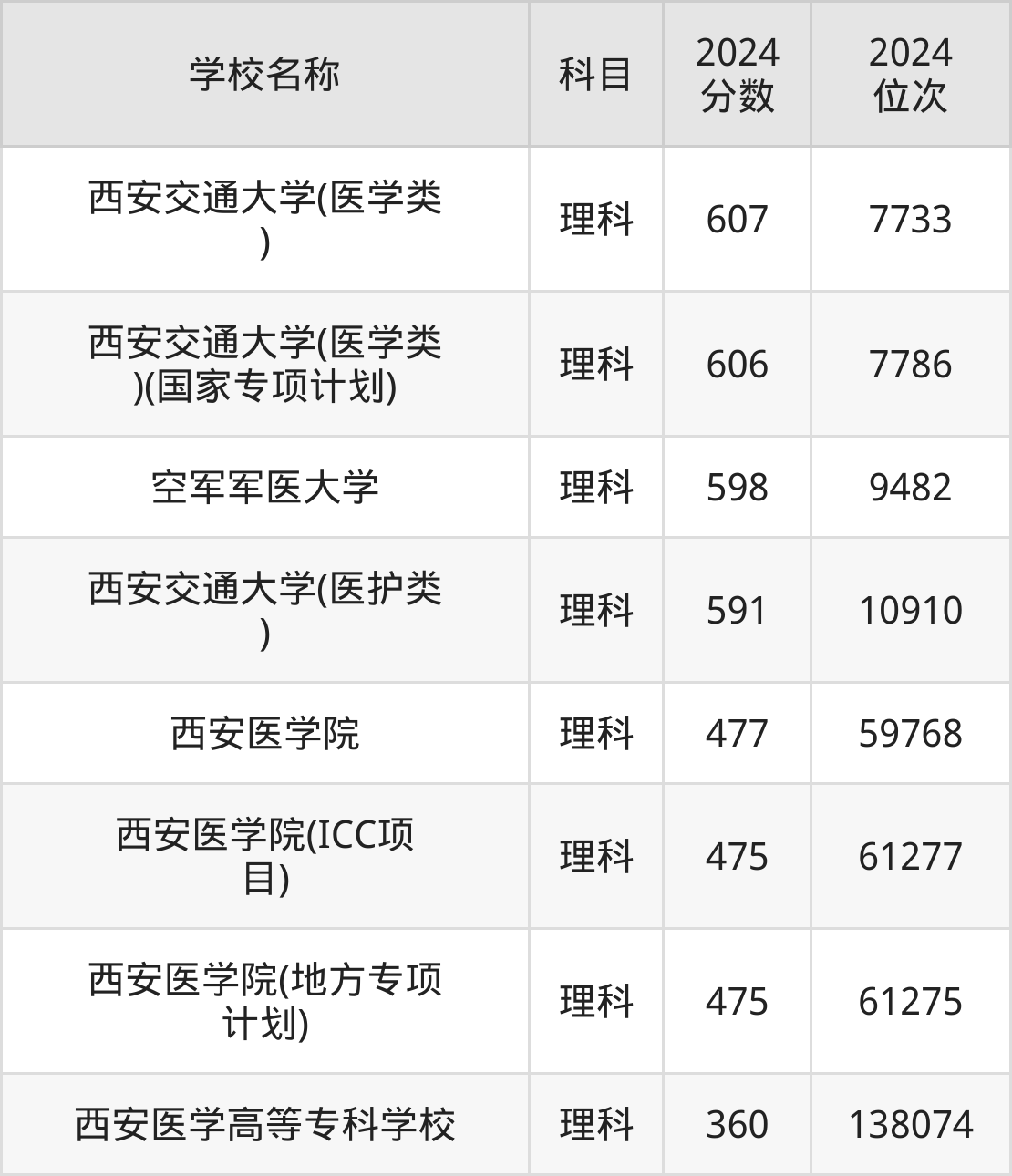 下文为2024年西安市医科大学在陕西理科录取分数线和位次排名表,供大家参考: