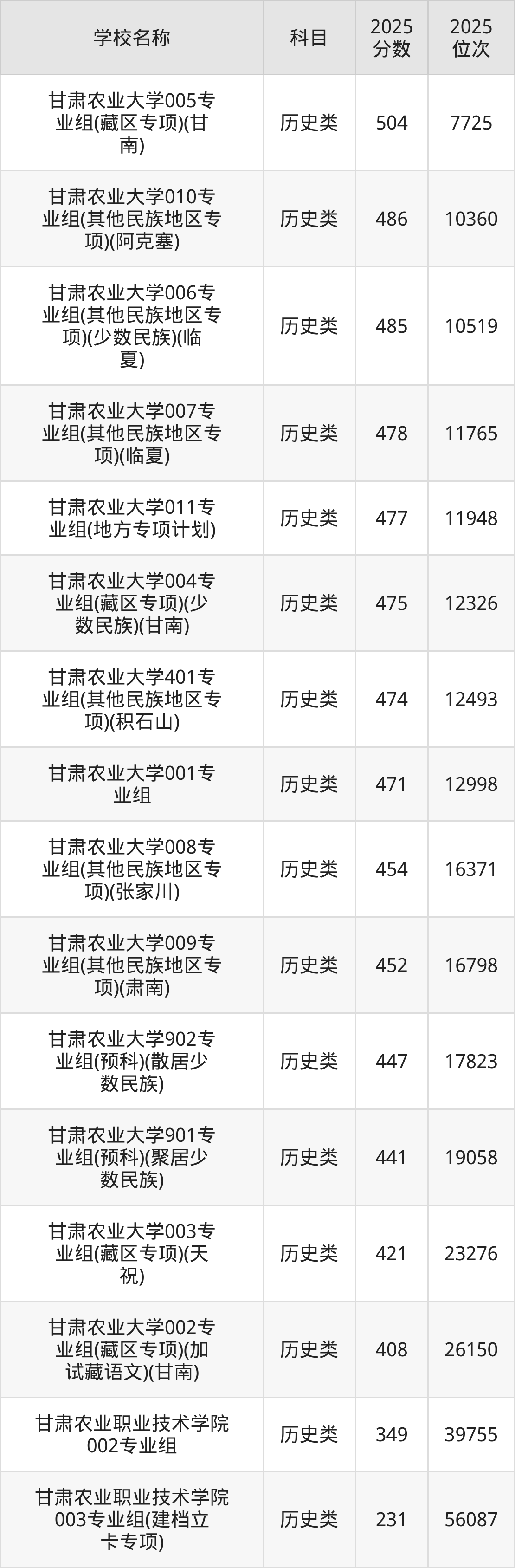 下文为2025年兰州市农林类大学在甘肃历史类录取分数线和位次排名表,供大家参考: