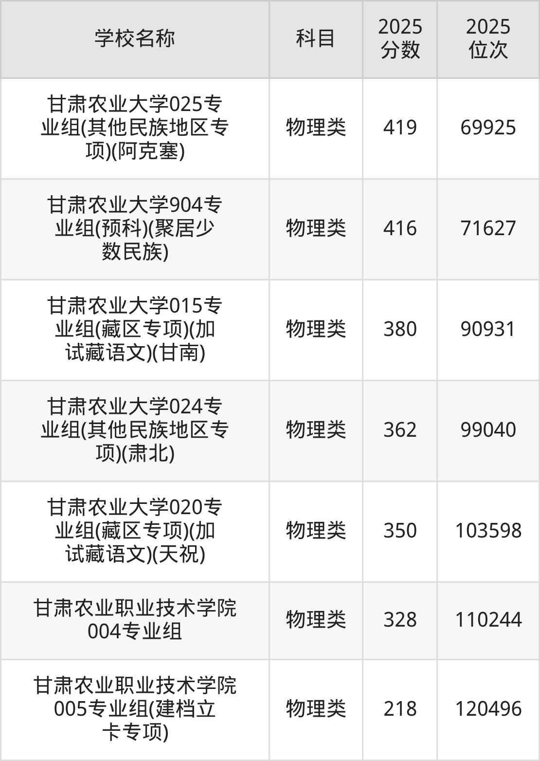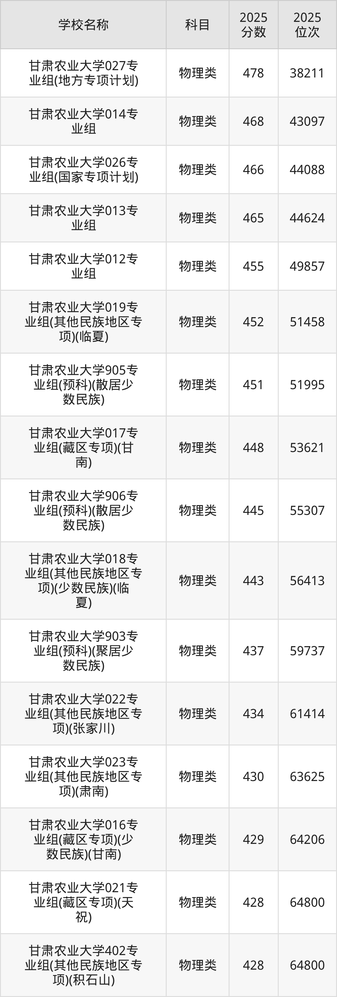 下文为2025年兰州市农林类大学在甘肃物理类录取分数线和位次排名表,供大家参考: