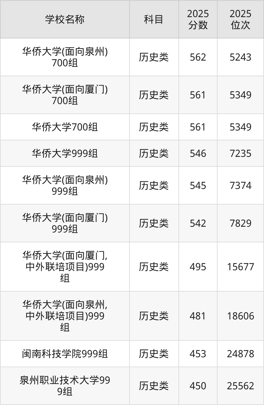 下文为2025年泉州市综合类大学在福建历史类录取分数线和位次排名表,供大家参考: