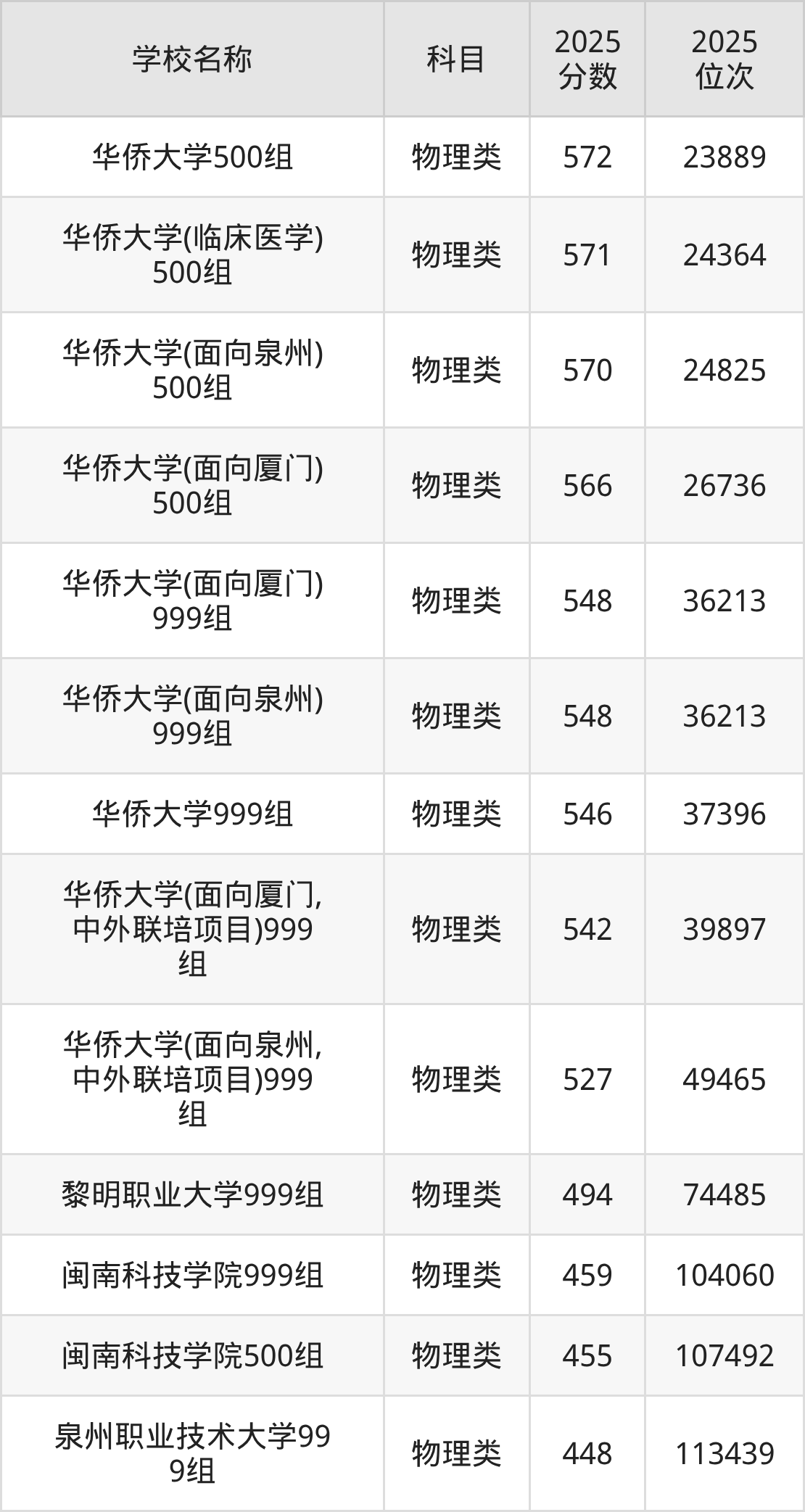 下文为2025年泉州市综合类大学在福建物理类录取分数线和位次排名表,供大家参考: