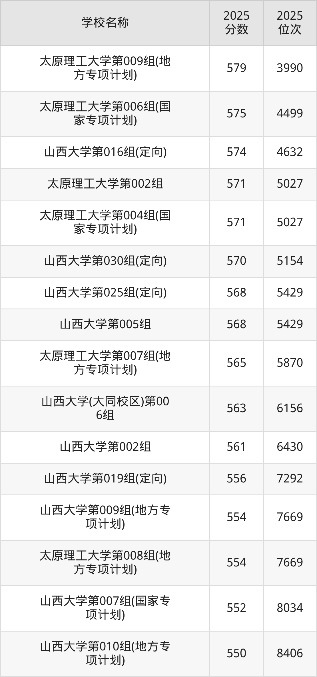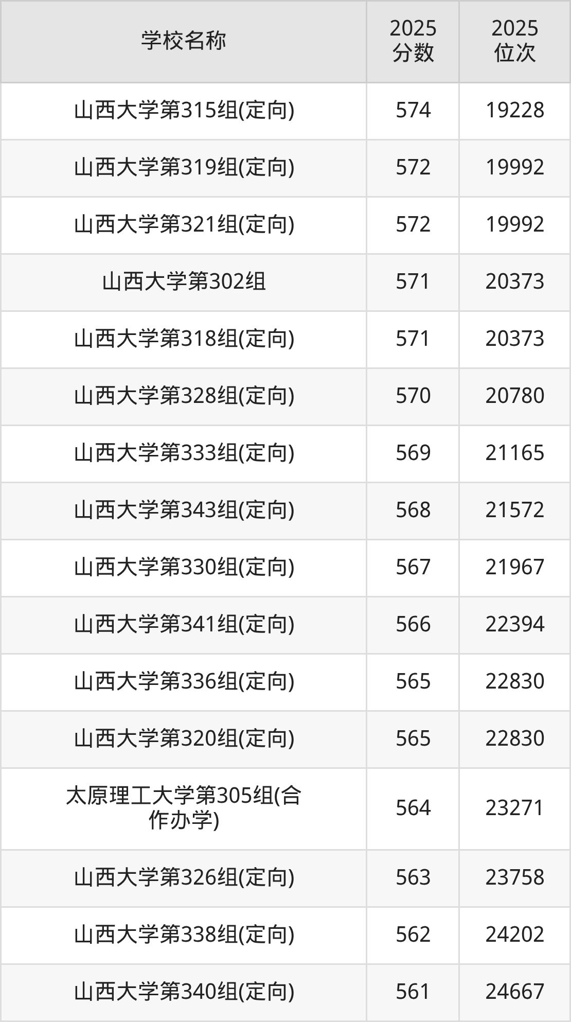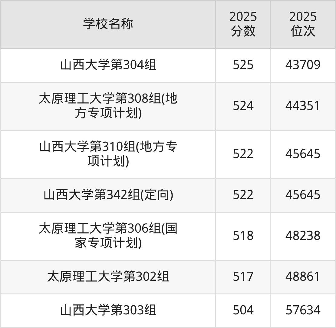 下文为2025年山西省双一流大学在山西历史类录取分数线和位次排名表,供大家参考: