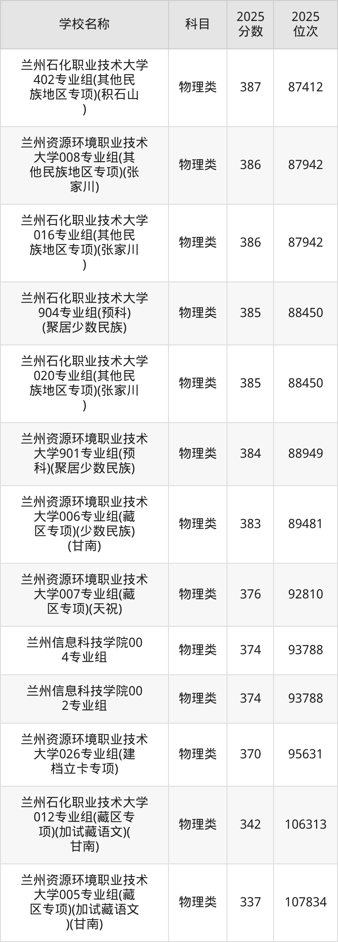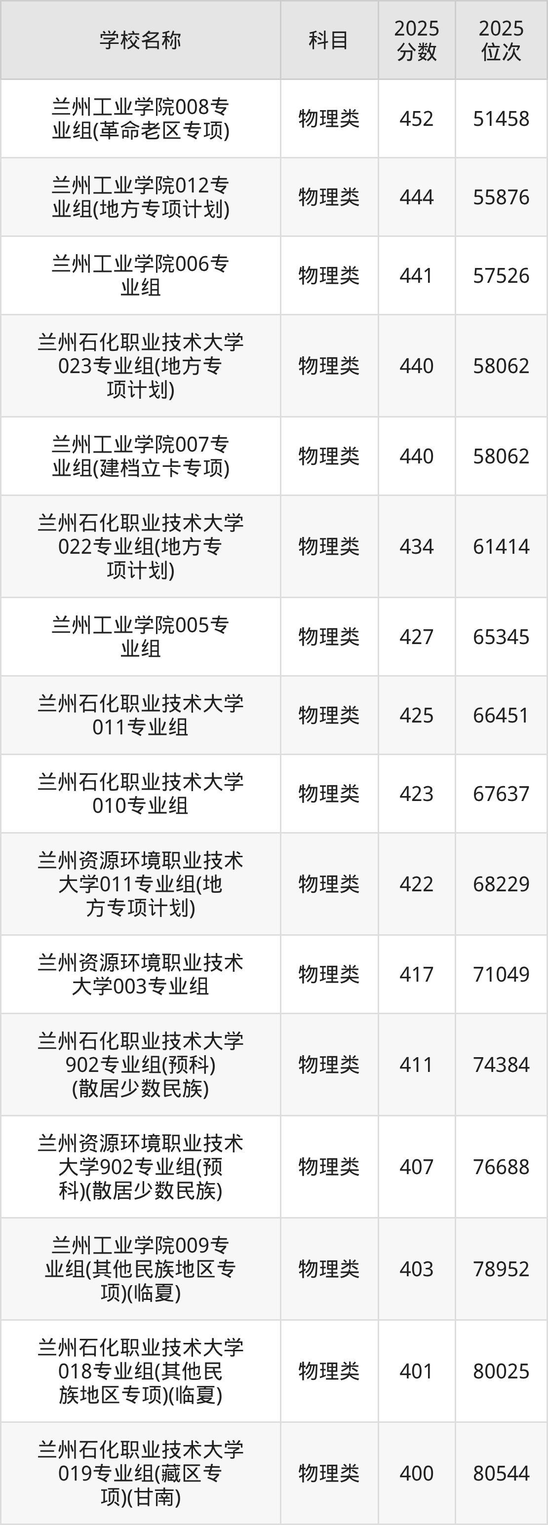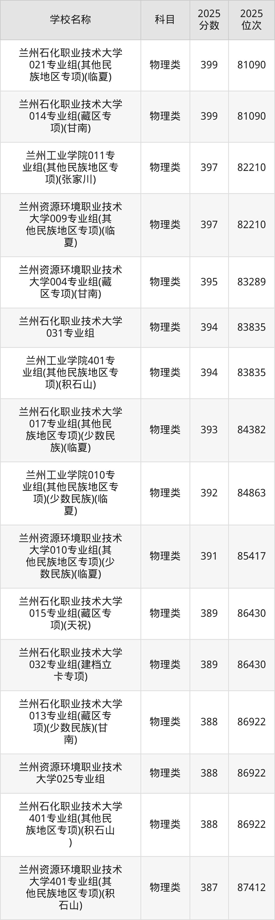 下文为2025年兰州市二本理工大学在甘肃物理类录取分数线和位次排名表,供大家参考: